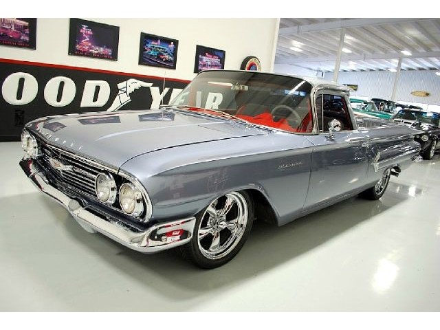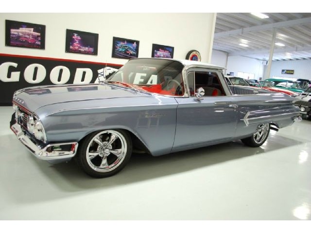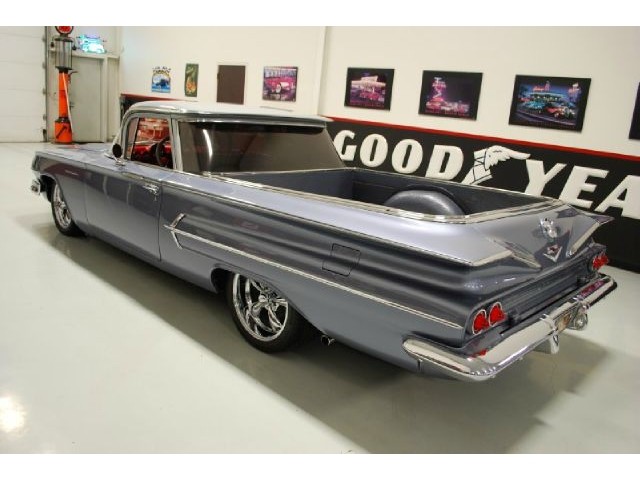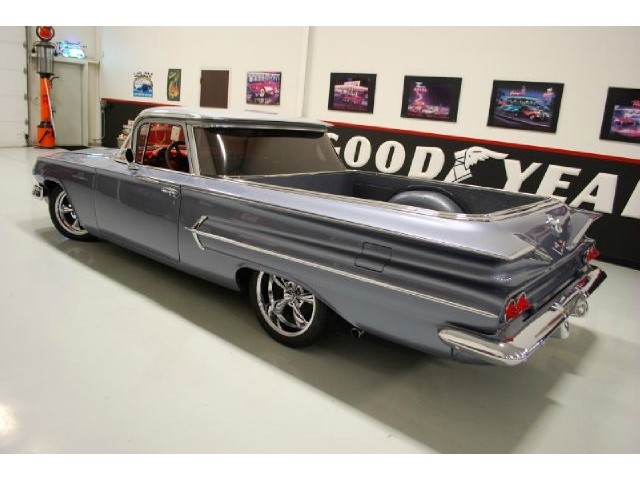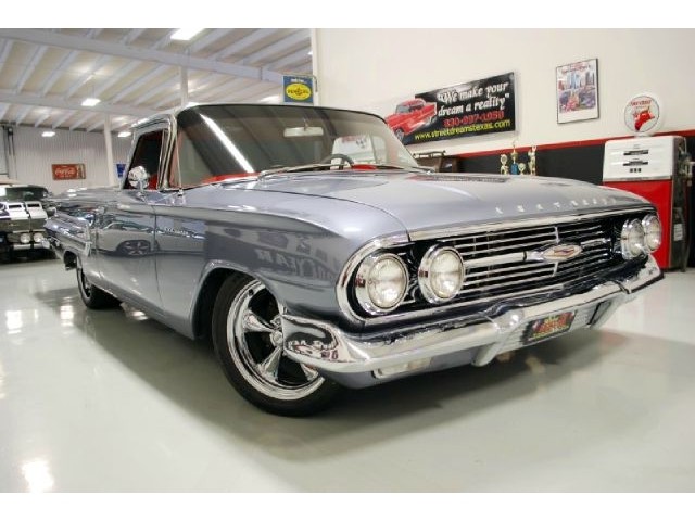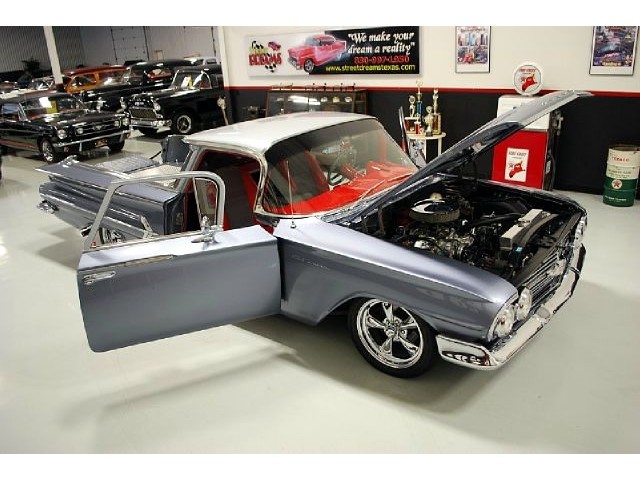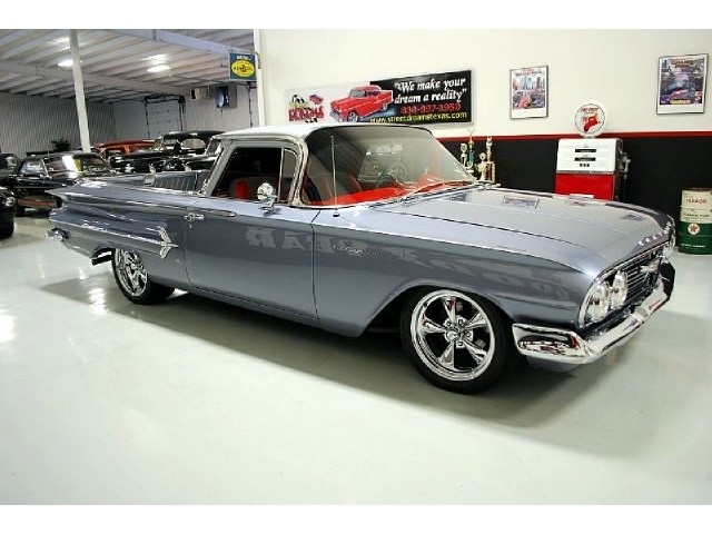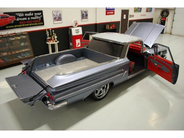 Welcome to streetdreamstexas online auction.  Please check our other items too as we own 50-60 Classics at all times.  We have been in business for 14 years this year.  Street Dreams strongly feels that investing in a classic car or truck is still one of the safest and definately the most fun place to have your money stored.  We are proud to unveil this killer street-rod El Camino.. by the way If you are into Chevy Metal (I know you liked that) you will love this El Camino! It has to be one of the most beautiful examples you will ever see. Especially a 59 or 60! Technically it is a RestoMod with updated power train, custom interior, modern paint (charcoal quartz like a Mercedes), awesome stance, and cold air conditioning. The body features all original sheet metal with no patch panels or rust. It is painted a fabulous Medium Quartz Gray with terrific trim, chrome, and glass. It is show quality and solid as a rock. The bed received a combination of polished corrugated metal and spray in bed liner. A very cool and functional touch. Power comes from a new 325 horsepower Jasper Crate 350 V-8 motor (with receipts) topped with  an Edelbrock manifold and carburetor combo. It has a HEI electronic ignition system, for this project a rebuilt 700R4 overdrive transmission was chosen which provides great highway cruising at lower rpm, it also features a SK700G shift kit providing a nice performance shift but still smooth, The rear end was just rebuilt with a very correct gear ratio 3.55:1 for great performance as well as great cruising of highway speeds. The custom dual exhaust system sounds terrific a nice mellow tone. For more comfort in driving it has a quick ratio power steering set up and power front disc brakes it gets down the road with ease and handles very well. The new 17 inch chrome American Racing Torque thrust II 5 spoke wheels give it an old school but with modern flare and are glued to the pavement with real heavy duty front/rear sway bars, gas shocks, and refurbished hardware. The full custom interior has very comfortable bucket seats, center console, Ididit tilt column, LeCarra leather steering wheel, Custom Auto Sound cassette 4 speaker stereo, Classic Auto Perfect System for air conditioning, and those fine looking two tone fabrics. It is comfortable and looks amazing sitting on high grade full custom carpeting. If you love an original body with all the trim but updated everything else, you should consider investing in the cool Elky.  It features a locking compartment in the front of the bed floor to keep your items hidden and locked away.  .  I promise it gets lots of attention and will win a multitude of awards. It has already placed at shows before yet could be driven every single day if that is your desire. Better have plenty of time to execute the honey do list cause you will be in the hardware store parking lot explaining this car for a half hour. Financing, insurance, and delivery are available on our own website streetdreamstexas give us a google.....