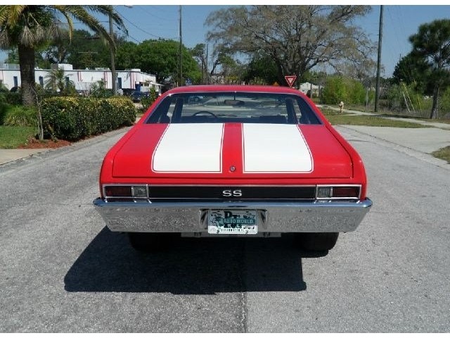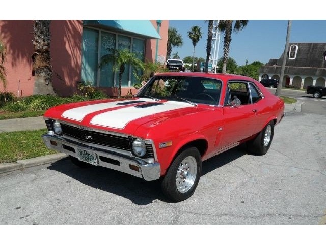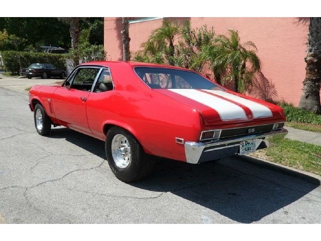 1969 Chevrolet Nova For Sale. 350 cubic inch V8, Edelbrock carburetor and intake, Hooker headers, dual Flowmaster exhaust, aluminum water pump and radiator, 12 bolt rear end, Slide A Link traction bars, custom built aluminum fuel tank, 15 Outlaw polished aluminum wheels with rear Mickey Thompson ET street tires, torch red exterior, white rally stripe package, SS trim, dual sport mirrors, bench seat interior, deluxe steering wheel, Autometer axillary gauges. This great looking entry level muscle car is sure to get your heart pumping every time you turn the key!!!