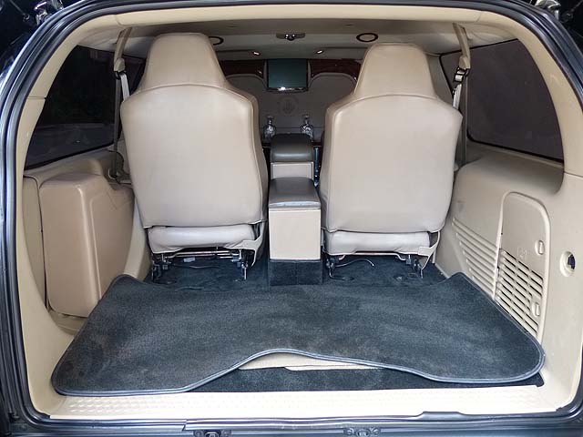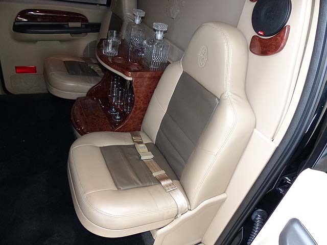 But enough for the mechanical stuff....what makes this Excursion really special is what lies in the passenger area.  Leather seating and high-gloss wood trim greet passengers with the style and luxury seldom found in an SUV.  Two rear-facing seats can be folded up if you need extra room, and there are forward-facing captain's chairs with power controls. Wooden work tables raise from the center console for those two seats, and there is a very large center storage console as well.