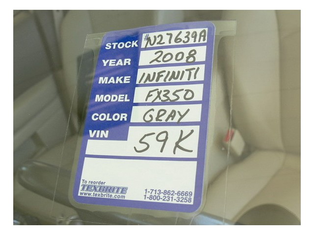 2008 INFINITY - FX35 - AUTOMATIC TRANSMISSION - BEAUTIFUL SHINY SILVER EXTERIOR WITH NICE TAN LEATHER INTERIOR - CLEAN CARFAX REPORT - THIS ONE HAS ALL THE RIGHT OPTIONS - DUAL POWER MIRRORS - POWER WINDOWS - POWER DOOR LOCKS - POWER DRIVER AND PASSENGER SEATING WITH POWER LUMBAR SUPPORT AND 2 POSITION MEMORY SETTINGS - HEATED FRONT SEATING - POWER TELESCOPIC ADJUSTABLE STEERING WHEEL WITH CRUISE CONTROL - BOSE AM FM STEREO SOUND SYSTEM WITH IN DASH DISC CHANGER - NAVIGATION SYSTEM - REAR BACKUP CAMERA - HOME LINK - POWER MOON ROOF - BEAUTIFUL FACTORY ALLOY WHEELS WITH NICE MATCHING SET OF HANKOOK TIRES