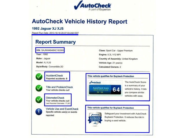 Carfax& Autocheck Certification. The certification indicates an accident free vehicle in excellent condition with only a very small portion of classic vehicles reflecting the quality score.