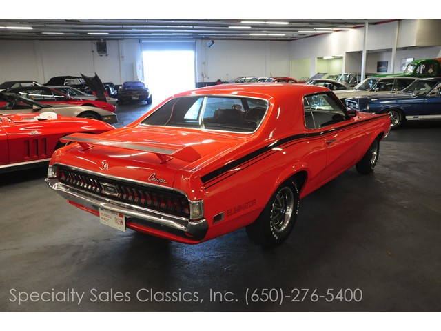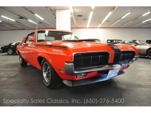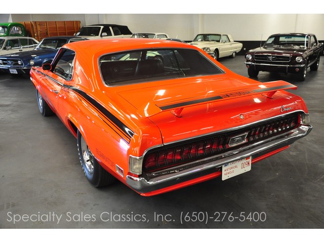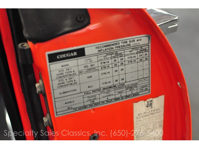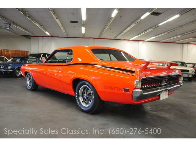 This 1970 Mercury Cougar Eliminator two door hardtop (Stock # 30841) is available in our Redwood City\, CA showroom and any inquiries may be directed to us at 650-276-5400 or via email at Sales@SpecialtySales.com.Pristine 1970 Mercury Cougar EliminatorUp for sale today is this 1970 Mercury Cougar Eliminator two door hardtop with Competition Orange paint and its original black interior. It features the numbers-matching 351 CI V-8 engine with the original FMX automatic transmission and it comes equipped with factory Whisper A/C\, power steering\, power front disk brakes\, the Competition Handling package and other standard features. The only modifications to this iconic classic are a mild camshaft and a Demon carburetor in place of the original 4BBL.Fully Restored in Early 90^aˆ™sThe current owner of this 1970 Mercury Cougar Eliminator has had it in his possession for the past 13 years\, and informed us that it was fully restored sometime in the early 1990^aˆ™s. While he believes that the 59\,337 miles are original\, we cannot prove that fact so we^aˆ™re only mentioning it. What we can prove\, however\, is that the entire drivetrain is original as is the every major mechanical component except for the camshaft and carburetor.For this 1970 Mercury Cougar Eliminator\, we have lots of original documents including the owner^aˆ™s card\, the window sticker\, the owner^aˆ™s manual and the Mercury build sheet. Besides the minor modifications listed above\, this vehicle is 100% original and it is in fantastic overall condition. It still drives like a classic muscle car should and it really gathers lots of attention wherever it goes.100% Authentic w/ Original Window StickerGiven this 1970 Mercury Cougar Eliminator^aˆ™s ample documentation and excellent overall condition\, we feel that it is likely one of the nicest original models available on the West Coast at this time. It^aˆ™s an absolute steal at the current asking price and given this vehicle^aˆ™s rarity\, it will be sold in a flash. For more information about this vehicle\, visit our Redwood City\, California showroom\, give us a call\, or email us at Sales@SpecialtySales.com. Be sure to mention stock # 30841 as well.The information presented for this vehicle is deemed reliable\, but is not guaranteed as a basis of purchase. The Buyer should make a thorough\, independent inspection and investigation of the vehicle prior to purchase.
