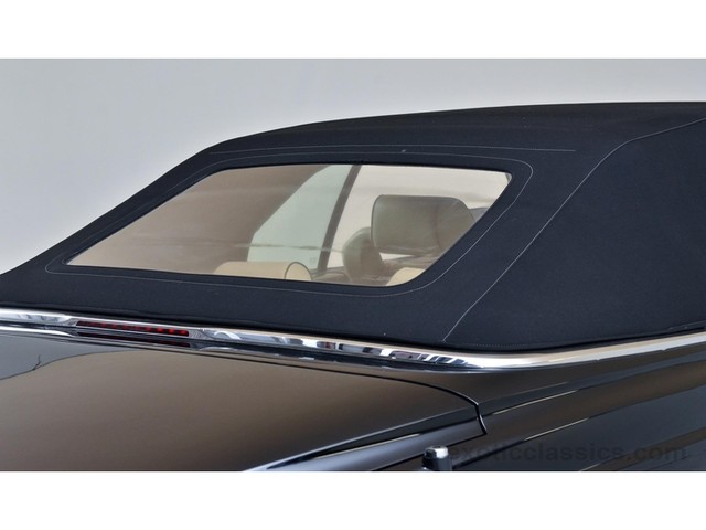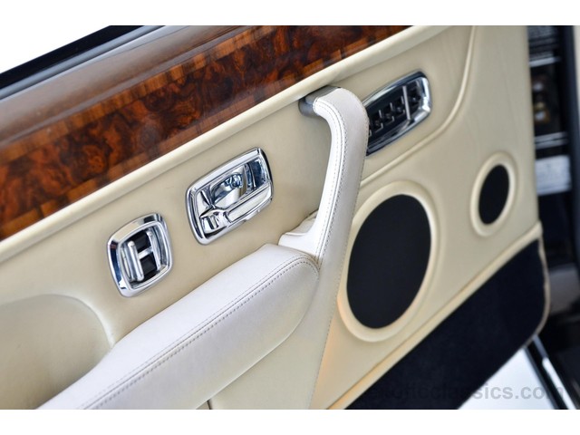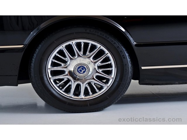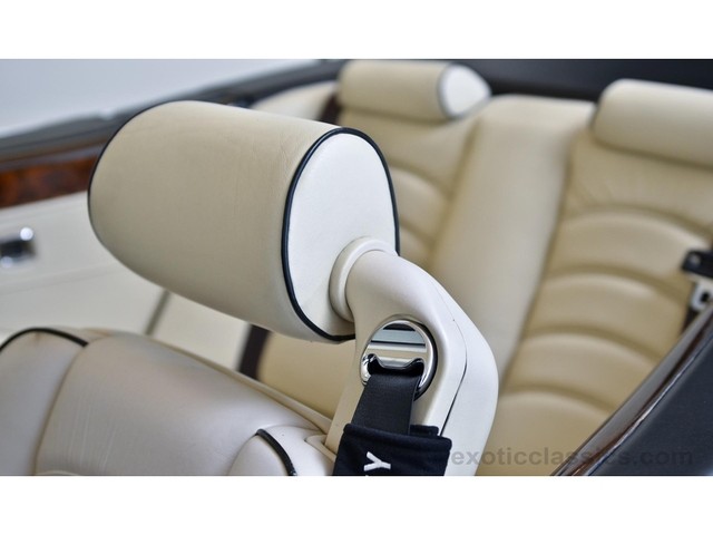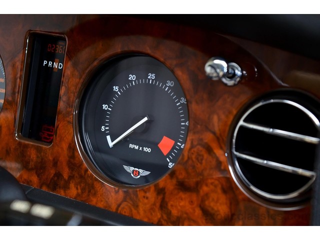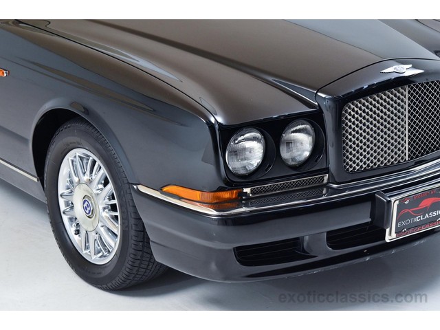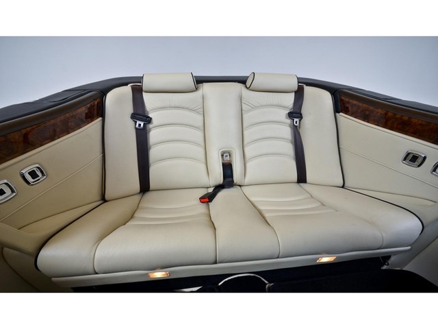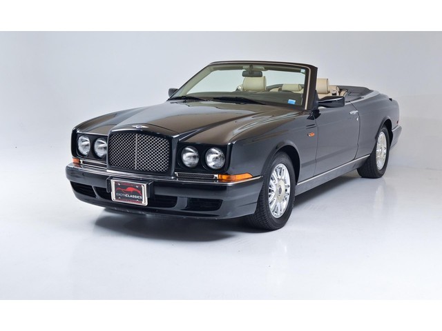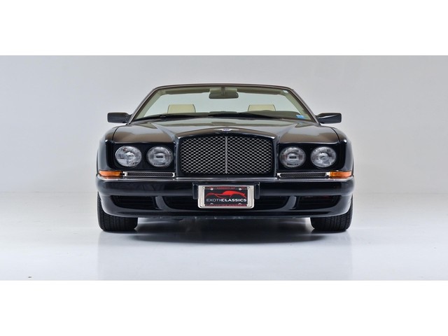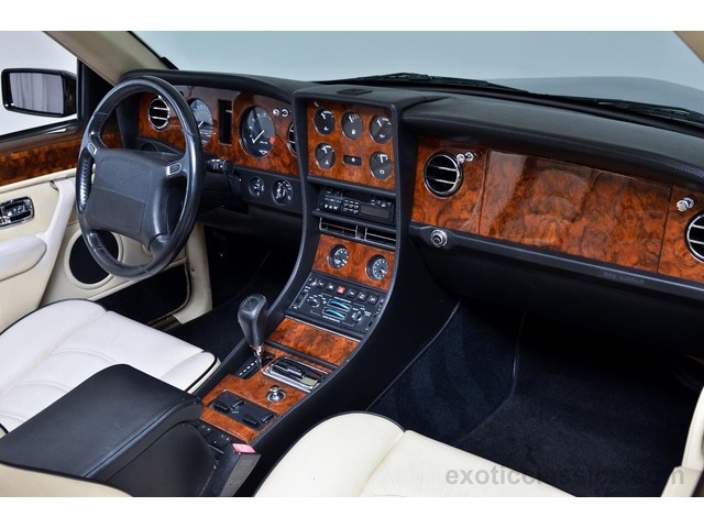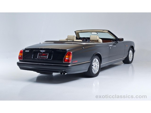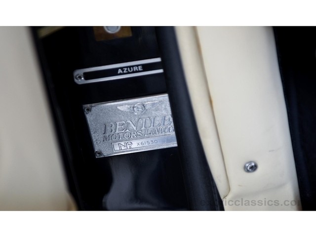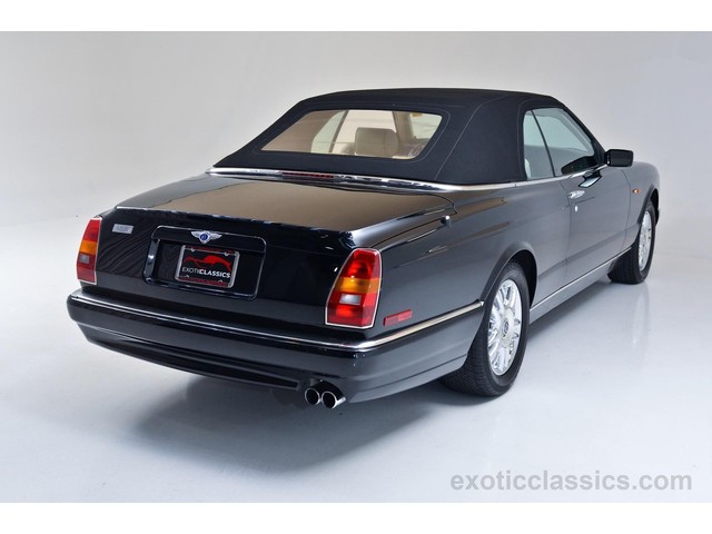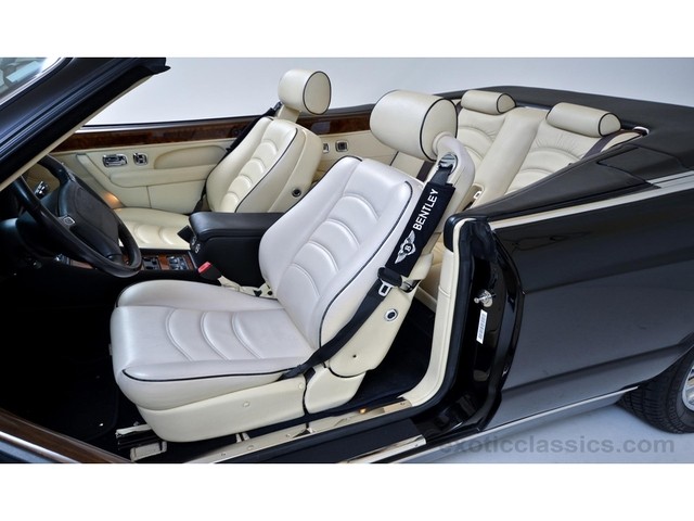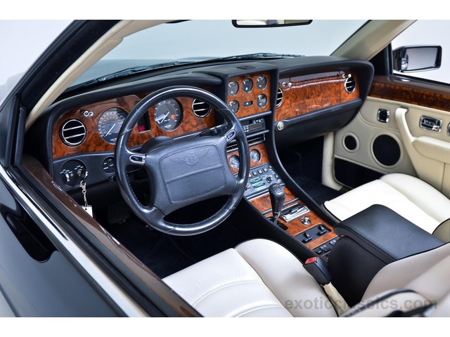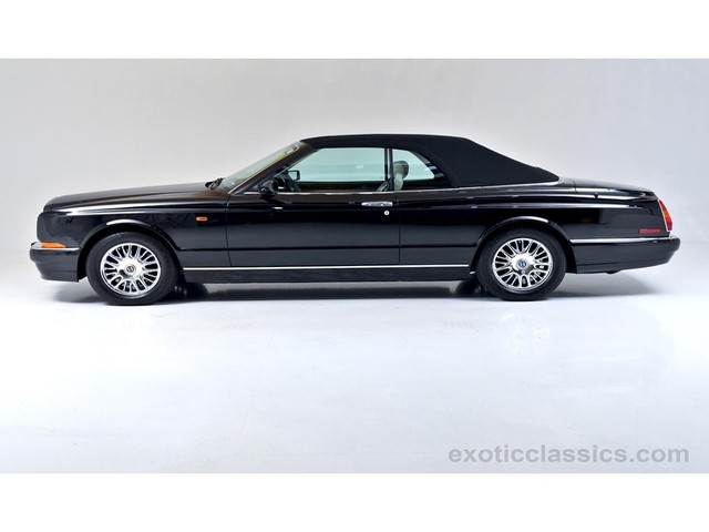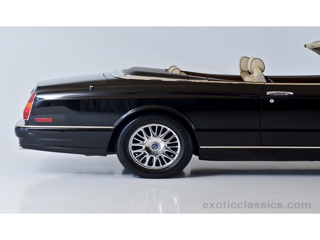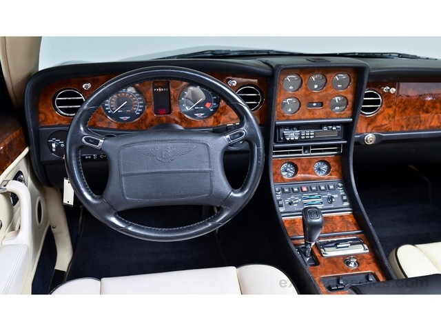 The Azure debuted in March 1995 at the Geneva Motor Show on the platform of the Continental R model, which had been originally launched in 1991. Production only crept to a start, with a mere nine examples finished in the first year - in 1996, after full production had started, no less than 251 Azures were finished.[2] Pininfarina assisted in the two-year process of turning the Continental R into a full four-seater convertible, and also built the shell and soft-top at their factory in Italy, largely from parts sourced in the UK. Final assembly was then carried out at Crewe. A roll-bar was never considered, which necessitated extensive reinforcing of the chassis.[3] At 210 in (5,340 mm) in length and 5,750 pounds (2,610 kg) in weight, the Azure often surprised onlookers with its size and bulk, intended to both convey a sense of "presence" and allow for comfortable seating of four adult passengers.Power came from the company's stalwart 6.75 liter V8, featuring a single, intercooled Garrett turbocharger and producing in the region of 360 hp - Rolls-Royce and Bentley did not yet give official power numbers at the time of the Azure's introduction.[4] By the time production began in earnest, new engine management from Zytek meant a slight power increase to 385 hp (287 kW; 390 PS) at 4,000 rpm and 750 N•m (553 lb•ft) of torque at 2,000 rpm; power was routed to the rear wheels via a modified, General Motors sourced, four-speed automatic transmission. With a zero to sixty miles per hour time of 6.3 seconds (0–100 km/h in 6.5 s) and a top speed of 241 km/h (150 mph),[5] the Azure was very fast for a car of its size, weight and poor aerodynamic profile.Owing to the limited space and workforce at Bentley's Crewe factory, the Azure's thick, powered convertible top was designed and manufactured by Pininfarina, which significantly added to the vehicle's cost. New in 1995, the Azure was priced at $347,645 -- $36,355 more than the Continental R on which it was based.