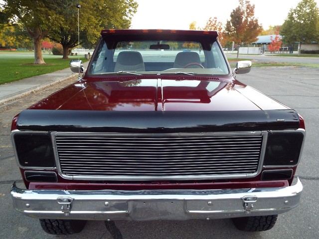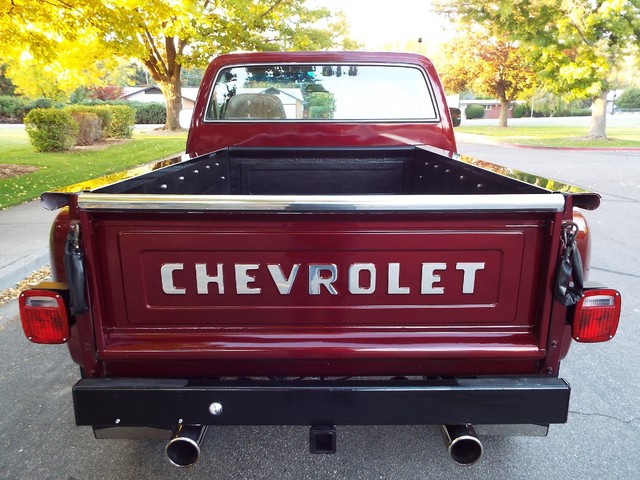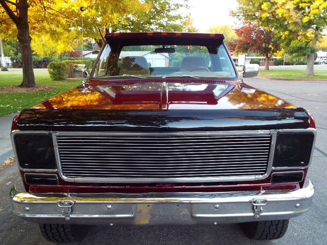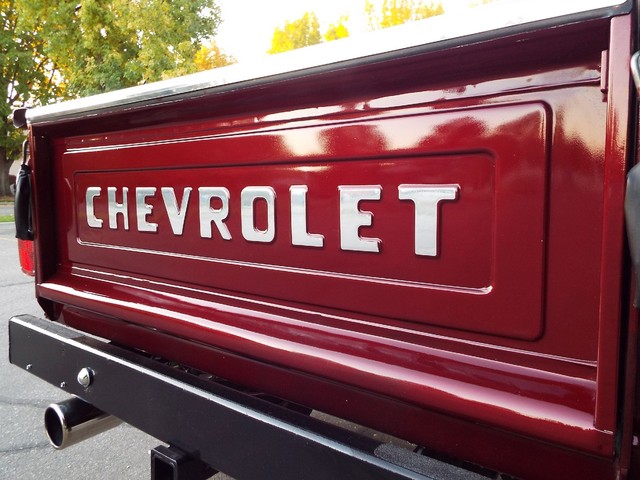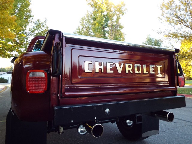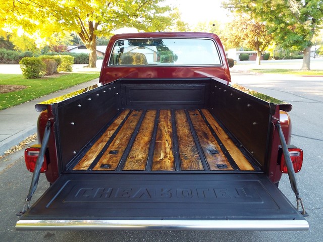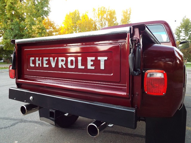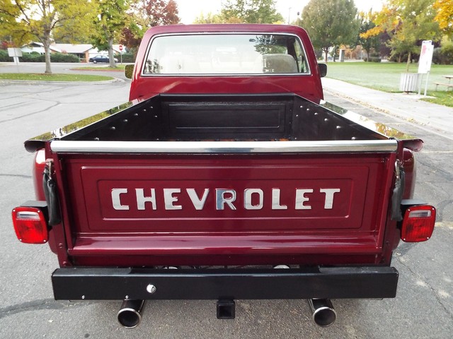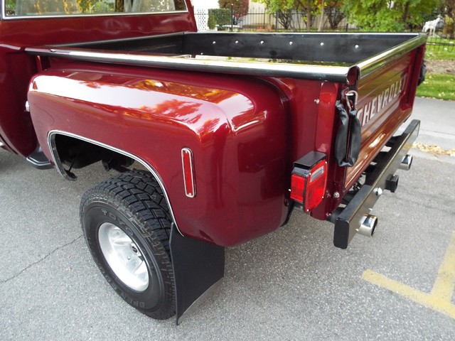 At the heart of this C10 Shortbox Stepside is a - STRONG - FRESH (Less than 20,000 miles) - 350 CID V8 crate motor that is running  VERY well indeed and sports an Edelbrock Performance four barrell aluminum intake manifold, mild Performance Comp cam, Custom high flow exhaust headers, Edelbrock performance four barrel carb with electric choke, Edelbrock valve covers and an Edelbrock custom air cleaner housing. Sounds GREAT too with a nice "THROATY" sounding  three inch "Big Dog" custom dual exhaust system with dual chrome tips. The engine is backed by a SMOOTH - four speed transmission, High / Low transfer case, new clutch and Warn manual locking front hubs all of which also all function very well. The VERY NICE Scottsdale optioned Tan cloth and vinyl interior is in VERY NICE condition with a VERY NICE Tan cloth bucket bench seat with center fold down padded armrest / center seat, NICE black carpeting, NICE ORIGINAL Black and Faux Wood Grain accented dash, VERY NICE ORIGINAL Factory gauge package, VERY NICE ORIGINAL Tan Vinyl dash pad with three small cracks, NICE Matching Tan vinyl door panels, VERY NICE custom Grant wood and chrome steering wheel and VERY NICE Tan Vinyl sunvisors. This C10 Stepside Pickup is nicely equipped including factory power steering, factory power brakes with discs up front, heavy duty Rancho 4 inch suspension lift, rebuilt steering box, custom chrome front inner fenders, factory power wipers,  factory seat belts, original day / night rear view mirror, good heater and defroster, optional factory guage package with amperage and oil pressure guages, factory wing windows, awesome Sony AM / FM / CD Player stereo radio with 2  Xplod mid-range speakers mounted in the doors and an enclosed subwoofer behind the driver's seat, optional dual fuel tanks,  aftermarket Stampede front bug shield, aftermarket smoked headlight covers, aftermarket 4 wheel mudflaps, High / Low range transfer case with Warn manual locking front hubs, dual chrome exterior side view mirrrors, optional soft ray tinted glass, dual "Bully" cab side steps, factory back-up lights, auxillary rear light bar with brake and back up lights, and a heavy duty rear bumper receiver hitch. Nothing needed on this BEAUTY, this Rig is ready to go ! It has  AWESOME looks and  AWESOME power as well !! These vehicles have an appreciative group of owners any of which would be pleased to own this one. The suspension, front and rear are in good working order as well as the electrical system. This vehicle is in BEAUTIFUL condition from top to bottom and from front to back. It will not disappoint someone looking for a great example of a sought after and hard to find C10 Shortbox Stepside Four Wheel Drive Pickup. If you have been looking but cannot find a great  C10 worthy of your hard earned money look NO further because this is the one! The Blood Red exterior finish on this C10 is EYE POPPING BEAUTIFUL with really little to no wear showing other than several small chips and imperfections and is still bright and shiny and looks STUNNING as you can clearly see in the picture and video above and the 100 ADDITIONAL PICTURES BELOW !! The AWESOME custom Center Line billet off-road wheels wrapped in nearly new - BEEFY - Toyo all terrain off road steel belted radials look OUTSTANDING on this truck and really give it that MEAN OFF- ROAD look ! All of the ORIGINAL chrome and stainless exterior trim on this C10 is VERY NICE including the VERY NICE ORIGINAL Chrome front bumper, NICE Black rear bumper, VERY NICE custom color matched exterior lighted  sunvisor, VERY NICE Chrome front and rear differential covers, NICE ORIGINAL Chrome headlight surrounds and a VERY NICE Chrome grill. The CLEAN - SOLID Bed sports NICE PINE wood flooring and custom chrome bed rails. This vehicle is in nice mechanical condition and it runs and drives very well including the four wheel drive with Warn manual locking hubs. I looked underneath and also included photos below.  Again this is a NICE - SOLID - DRY - Oregon - Idaho high mountain desert  vehicle and it has plenty of good looks to boot! In my opinion you're not going to find much nicer ORIGINAL FLOORS than the ones on this C10 !!