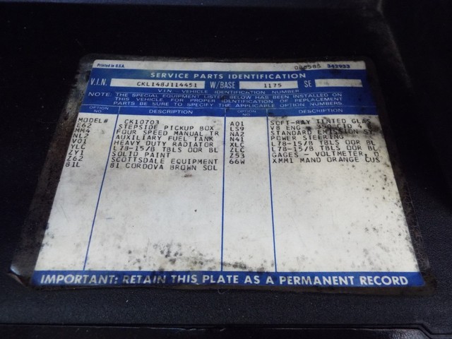 Correctly Mounted Factory Original Chevrolet Drivers Door Pillar Mounted Data Plate