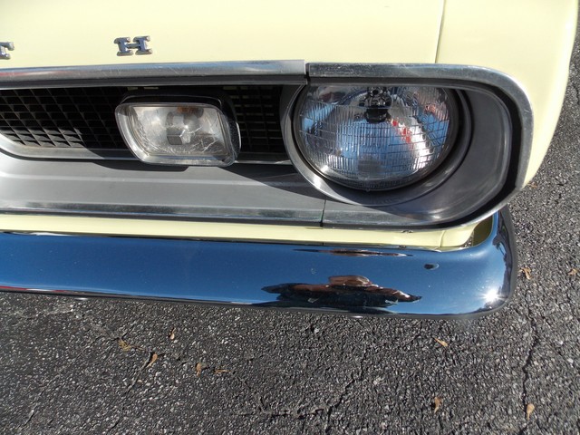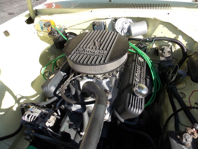 The car was restored by replacing the engine with a 360 V8 rebuilt with a mild hydraulic cam and .30 over pistons, an Edelbrock high rise intake manifold and a Holley carb. The exhast has headers and round style mufflers, sounds great not too loud but strong.The automatic trans was rebuilt and the 8 3/4 rear was given a posi and 3:55 gears. All new tires 195/70/14 Bridgestones on steel wheels with dog dish caps. The body was stripped to bare metal; the windows were removed and the car was resprayed in base yellow with clear on top. Not a show paint job, a few blemishes, but it looks great. New rubber windsheild gaskets were installed and both bumpers were rechromed. The interior was completely replaced. New headliner, new dash pad, new carpet and seat covers.