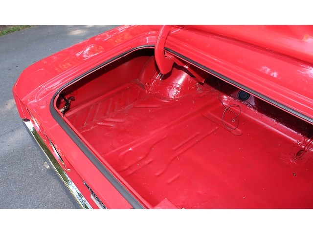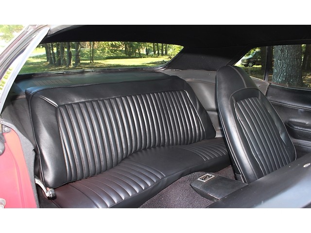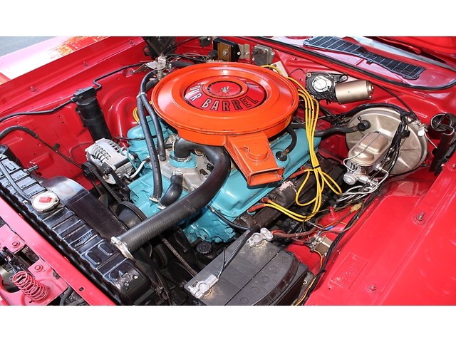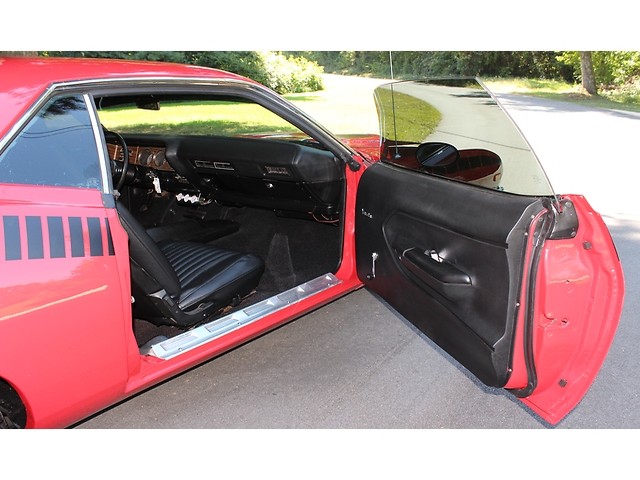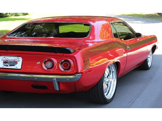 We will start off with the exterior of the Cuda. The body is straight as an arrow with good gaps and lines. It’s covered in the Rallye Red paint that is accented by the black spoiler and black stripes. The paint has a deep rich shine. Also, it had new bumpers as well as weather stripping at the time of the resto. The side glass and back glass were tinted to really set the whole exterior look off. The stainless and grill looks very good, and it comes with the dual sport mirrors that were painted to match the car. The final exterior touch is the set of 18” and 20” American Racing Wheels.