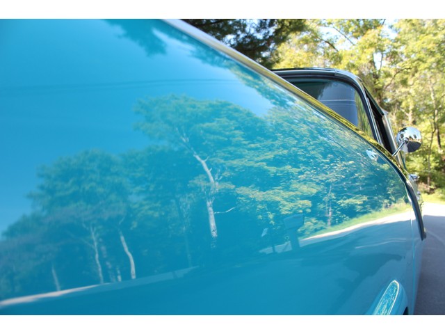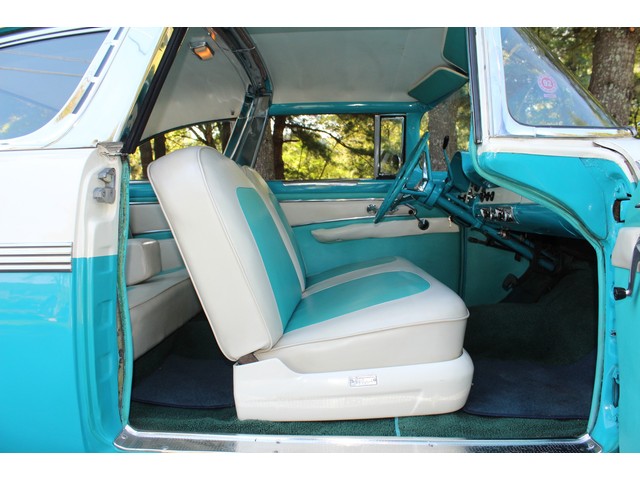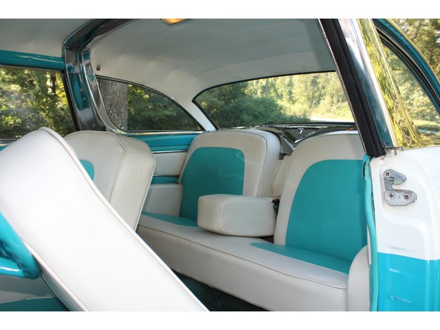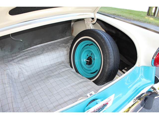 Next, we will take a look at the interior of the ’56. It is all done in the correct style and color to accent the exterior. All the seats, carpet, door panels, and headliner have been redone. When you look at the dash it’s all correct even down to the radio. All the stainless trim is very good.