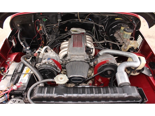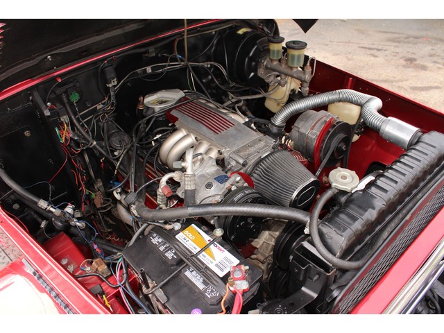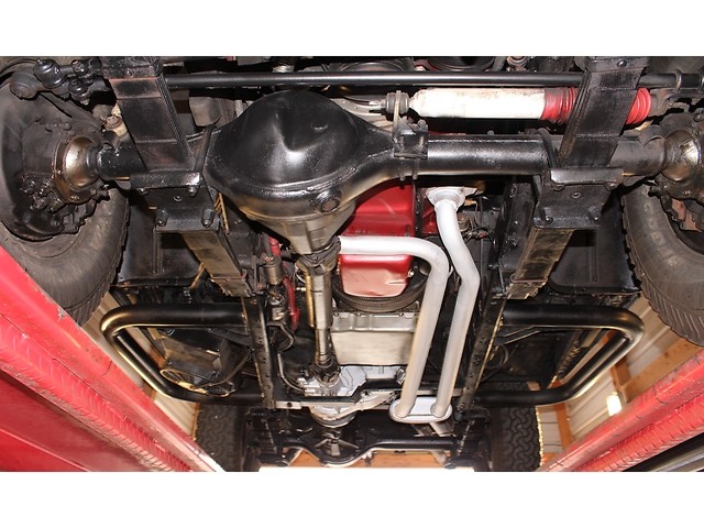 Finally we will take a look at the driveline of the Toyota. Under the hood you will see no more 4 cylinder, better yet it now has a Tuner Port Injected 350 Chevy V8. It has aluminum heads with coated Shorty Headers. The trim on the engine was painted to match the exterior. The trans is a Chevy Turbo that’s hooked to the stock transfer case and rear ends. Also they added electric fans and K&N Filters. It comes set up with Power Steering and Power Disc Brakes. To save space the exhaust is 2” to 1” with a Flow Master Muffler.