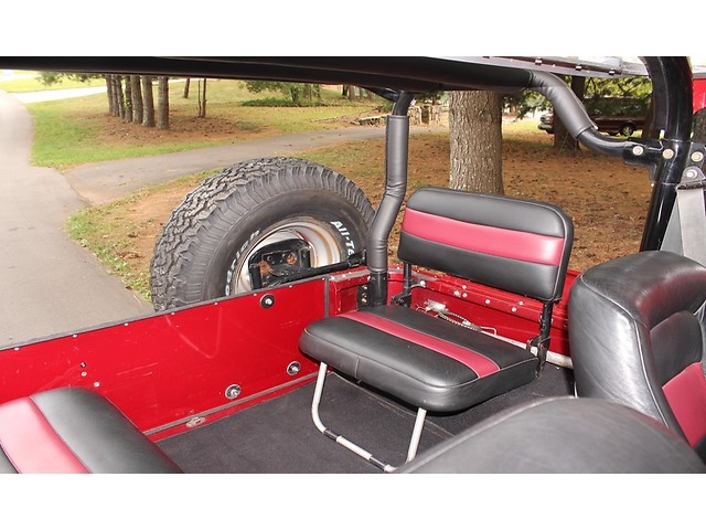 Next, we will take a look at the interior of the ’76. It’s every bit as nice as the exterior with the seats being covered in black leather with reinserts that complement the exterior scheme perfectly. They match the door panels that are also covered in black leather. The steering was upgraded to a tilt column. Also, it has power windows, cd player (that’s hidden under the seat as to not cut on the dash), and don’t forget the Vintage AC. The dash looks stock with only a few after market gauges. Before they installed the floor mat they painted the floor to match the exterior of this 4X4.