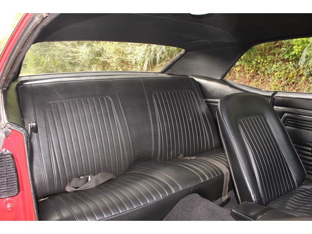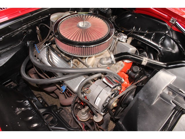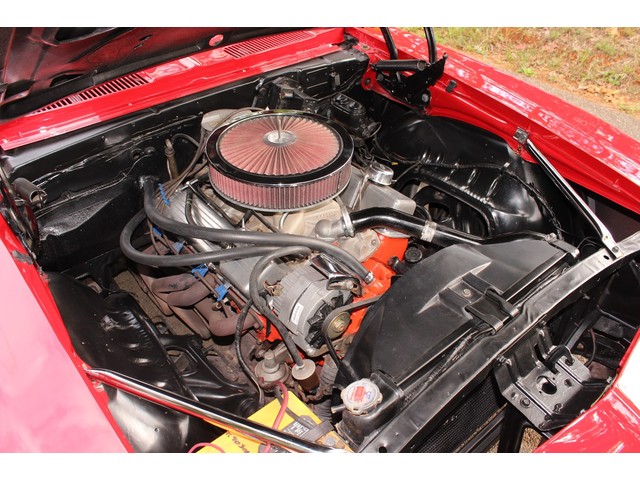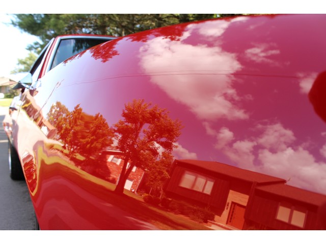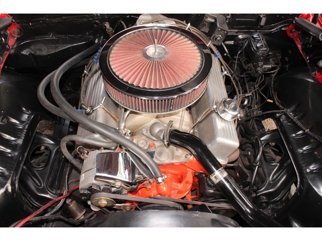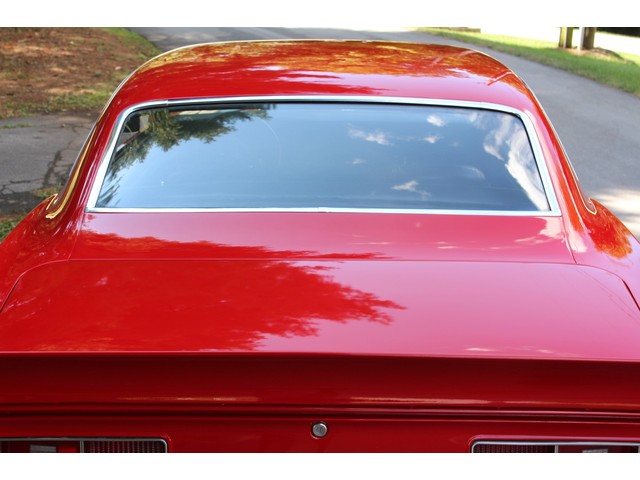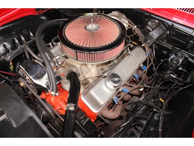 We will start off with the exterior of the Camaro. The body is arrow straight good gaps and lines. It has a 2” Steel Cowl hood along with new bumpers and other chrome. All the weather stripping was replaced to ensure a good tight fit of the doors and trunk. The Camaro is covered in Victory Red Paint that shows well with a deep rich shine. All of the glass and stainless looks good. The final exterior touch is the set of Americans on the Corners.