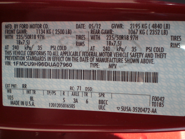 • VIN: 1FMCU9H96DUA07960