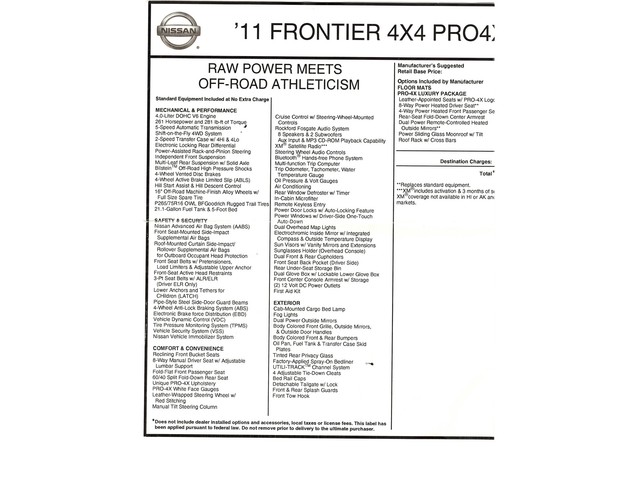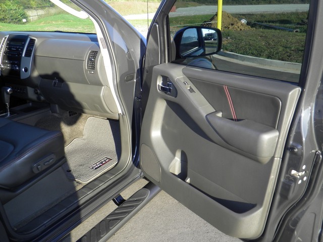 JUST IN ON TRADE IS THIS 2011 NISSAN FRONTIER CREWCAB PRO-4X OFFROAD 4X4, NIGHT ARMOR IN COLOR, GRAPHITE LEATHER WITH RED STICHING, 4.0 DOHC V-6 261HP, 5SPD AUTOMATIC, SHIFT ON THE FLY 4X4 SYSTEM, 2 SPEED TRANSFER CASE WITH 4HI 4LO, ELECTRONIC LOCKING REAR DIFFERENTIAL, HILL START ASSIST & HILL DESCENT CONTROL, 16" OFF-ROAD MACHINE -FINISH ALLOY WHEELS WITH ALMOST NEW TIRES , K&N AIR INTAKE, 21.1 GALLON FUEL TANK WITH 5FT BED, PRO-4X UPHOLSTRY WITH WHITE GAUGES, ROCKFORD FOSGATE AUDIO SYSTEM  WITH 8 SPEAKERS AND 2 SUBWOOFERS, XM SAT RADIO, BLUETOOTH, FOG LILGHTS, BODY COLORED GRILL AND BUMPERS, SKID PLATES, UTILI TRACK WITH 4 ADJUSTABLE TIE DOWNS, CLASS III TOW HITCH, LUXURY PACKAGE WITH LEATHER/POWER AND HEATED FRONT SEATS, POWER SLIDING GLASS MOONROOF, ROOF RACK WITH CROSS BARS, THIS TRUCK IS SUPER CLEAN RUST FREE SOUTHERN TRUCK WITH ONLY 24,277 MILES, IT'S FULLY SERVICED AND INSPECTED AND COMES WITH BALANCE OF NISSANS FACTORY WARRANTY.