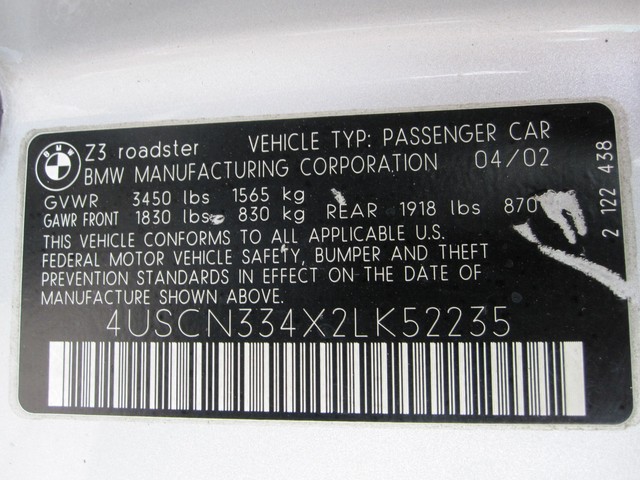 imageInformation Reported! AutoCheck shows additional information reported to AutoCheck about how this this 2002 BMW Z3 (4USCN334X2LK52235)has been used and other events.This includes reported vehicle uses such as rental or lease, and events such as whether the vehicle has been reported to have had a loan/lien or a duplicate title issued. Other events show if the vehicle has a reported accident and how many calculated accidents or if it has been reported stolen or repossessed. AutoCheck It is recommended to have pre-owned vehicles inspected by a third party prior to purchase.