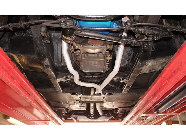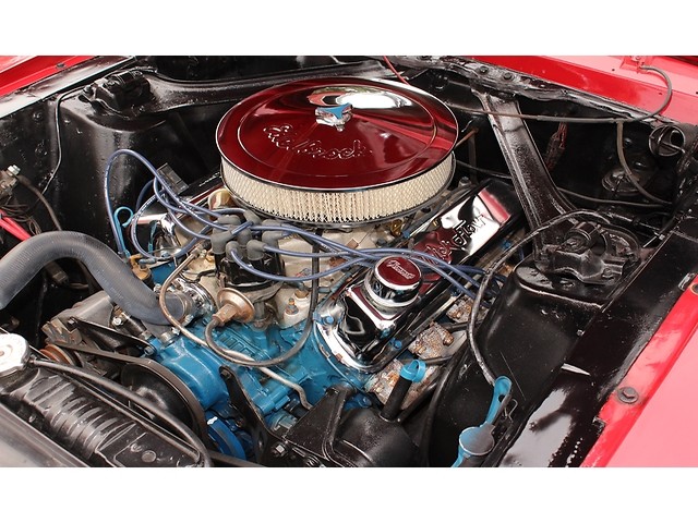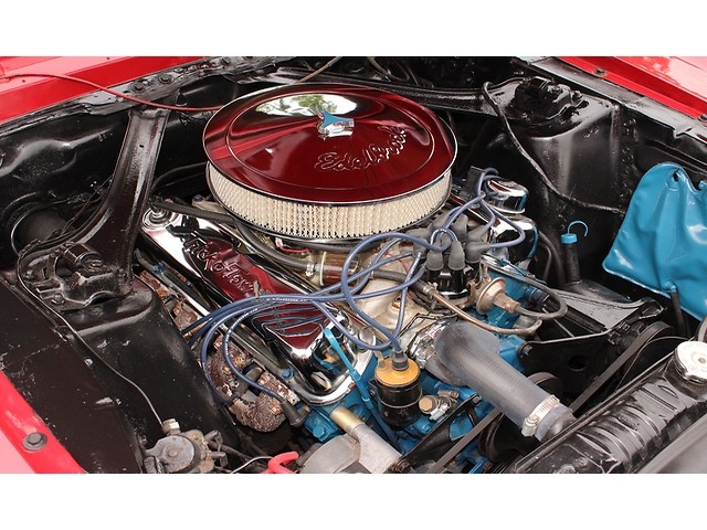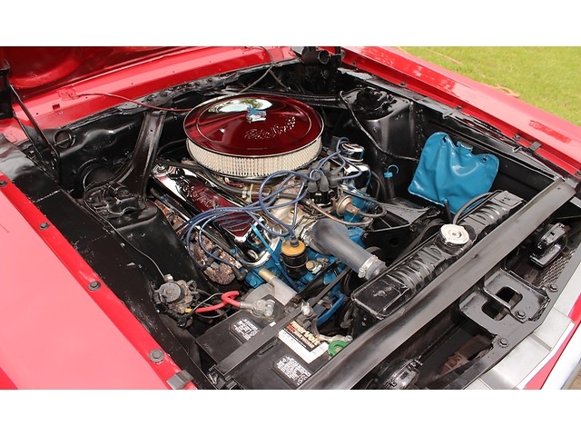 Finally, we will take a look at the driveline of the Ford. Under the hood it looks clean and neat. The engine is a 289 V8 that is mated to a C4 Trans and a 8” Rear End. It has an Edelbrock intake and carb with chrome valve covers and breather. This Stang retains the stock manifolds and single exhaust. It has 4 Wheel Drum Brakes and Power Steering. When looking at the floors they are good and have had some work but appear solid.