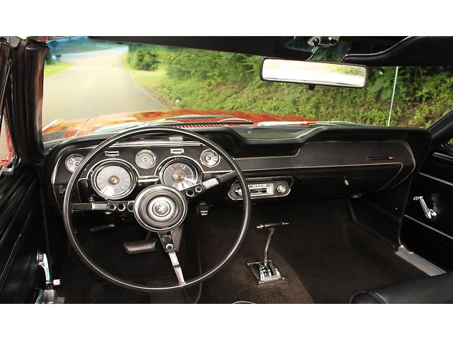 Next, we will move on to the interior of the ’67. It’s all done in black that really flows the exterior and interior together beautifully and provides an excellent complement to the top and boot. As with a lot of these Stangs it’s a console delete. It does have the correct floor shifter. The seats, carpet, and door panels appear very good. When looking at the dash it’s correct with only an update to the radio.
