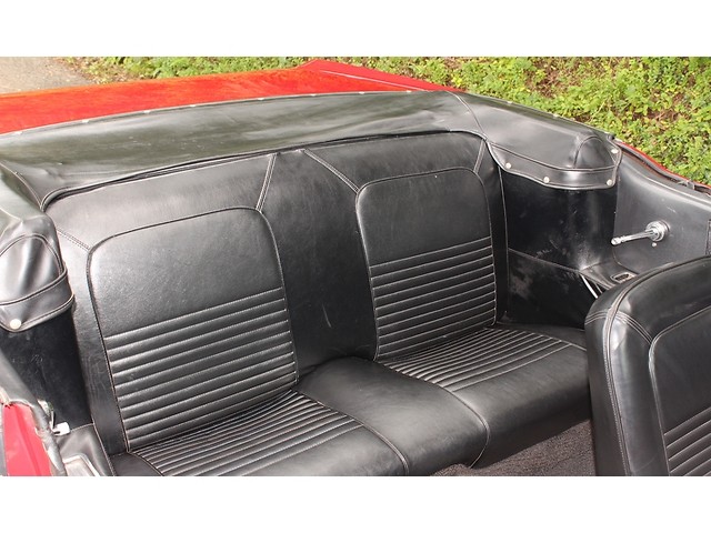 We will start off with the exterior of the Mustang. The body is laser straight with good fit and finish of the gaps. It’s covered in the Candyapple red paint that looks great with a deep rich shine. When looking at the chrome and stainless it all looks very good as well. All the glass is good with the side windows working as they should. At the time of the restoration a new black convertible top was added along with a new back window. It also has a new boot to keep everything clean when the tops down. The final exterior touch is the set of 18" and 20" Americans with new tires.