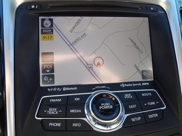 The options and features include: Driver/Front Passenger Advanced Frontal Airbags, Engine Immobilizer System, Front & Rear Side Air Curtains, Front Side-Impact Airbags, Keyless Entry Integrated Anti-Theft System & Panic, LATCH Child Safety Seat Anchors & Tethers, 8-Way Power Driver Seat w/Adjustable Lumbar, AM/FM/XM/6-Disc CD/MP3 Stereo, Auto-Dimming Interior Rearview Mirror, Dual Fully Automatic Climate Control, Heated Front & Rear Seats, Infinity 8-Speaker Sound System, iPod/USB Auxiliary Input Jacks, Leather Seating Surfaces, Navigation System w/High-Resolution Touch-Screen, Power Door Locks, Power Windows w/Driver Auto Down/Up, Rear Backup Camera, Steering Wheel Mounted Audio Controls, Steering Wheel Mounted Bluetooth Phone Controls, Steering Wheel Mounted Cruise Control, Tilt & Telescopic Steering Wheel, 2-Speed Intermittent Speed Sensitive Wipers, Front Fog Lights, Power Glass Sunroof, Power Heated Exterior Mirrors w/Signals, Remote Keyless Entry, 4-Wheel Disc Anti-Lock Brakes, Electronic Brake-Force Distribution & Brake Assist, Electronic Stability Control & Traction Control, Engine-RPM-Sensing Power Rack & Pinion Steering, Tire Pressure Monitoring System
