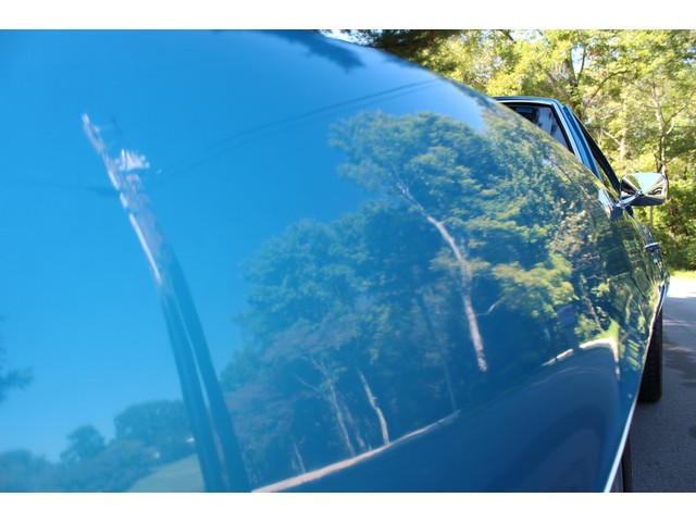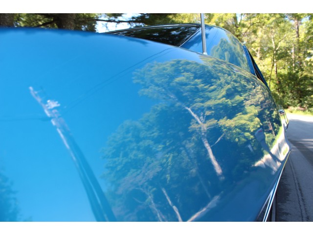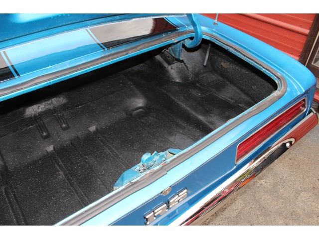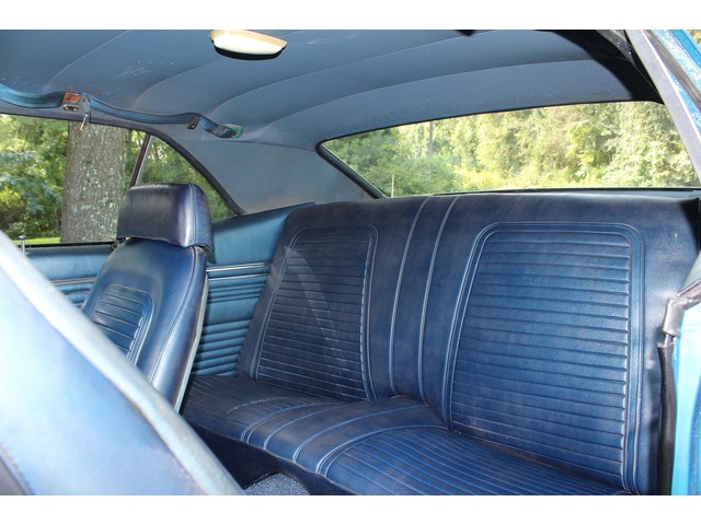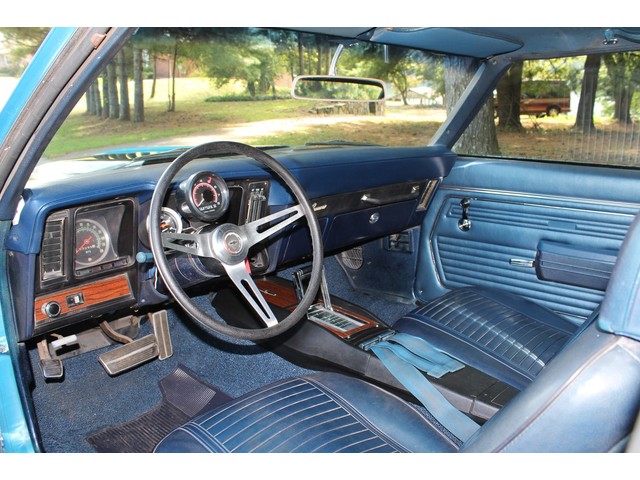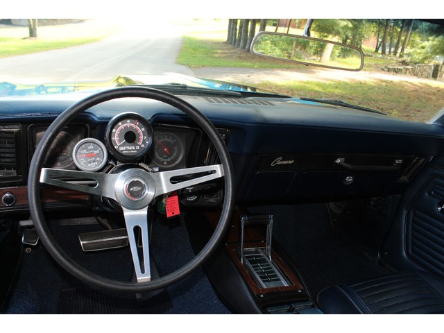 Next, we will take a look at the interior of the ’69. It’s all done in the dark blue with the correct bucket seats and console with the Horse Shoe Shifter. Most of the interior looks to be factory with only the carpet being new. It has had a custom grip steering wheel along with an aftermarket tach and gauges added. The lights, wipers, and even the horn works.