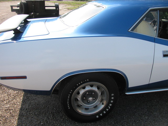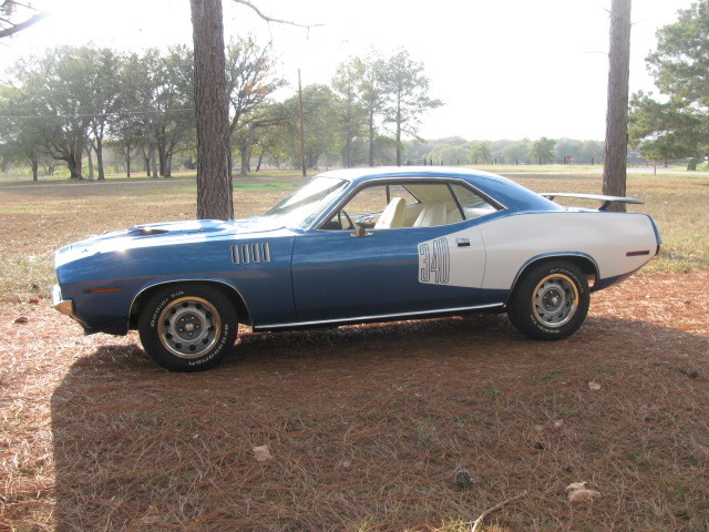 Up for auction is a 1971 Plymouth "Cuda with matching #'s HP 340 engine,4-speed manual transmission, 3:55 sure grip. Complete restoration,only one repaint with all original metal and original body panels. This car has been documented by the factory fender tag and original build sheet.  Everything was done to factory specs. All mopar hoses,belts,etc.  I have the original 7"X15" rallye wheels with correct wide oval Poly Glass Good Year Tires. The rallye wheels and tires that are on the car now will go with the sale including the factory wheels. The trunk holds the correct space saver spare. It is missing the air canister,bracket is there,no bottle.  This is a rust free car with it's original body panels and original drive train. Only 41228 miles showing, believed to be  correct milage, but I do not have proof of milage.  This car has been fully restored in it's original color of B-5 Blue. This is a no excused car. The color of the interior was changed from black to white at time of restoration. The white interior is not a reproduction. It was removed from another  cuda many years ago. It has not seen sun light until being installed in this gorgeous Cuda.  The following options have been added: White Bill boards,rear wing, and front chin spoilers.  The original dash has a crack  close to the center by the speaker.  The sail panels are a bit loose.  the paint is very nice with no chips or scratches. There is one tiny scratch on the passengerside front lower body in the black painted area.  Please call 361-319-0230 for more information. I can send additional pictures to serious buyers. It will be very hard to find another 71 340 4-speed cuda with matching engine,etc.  You will not be disappointed with this car.