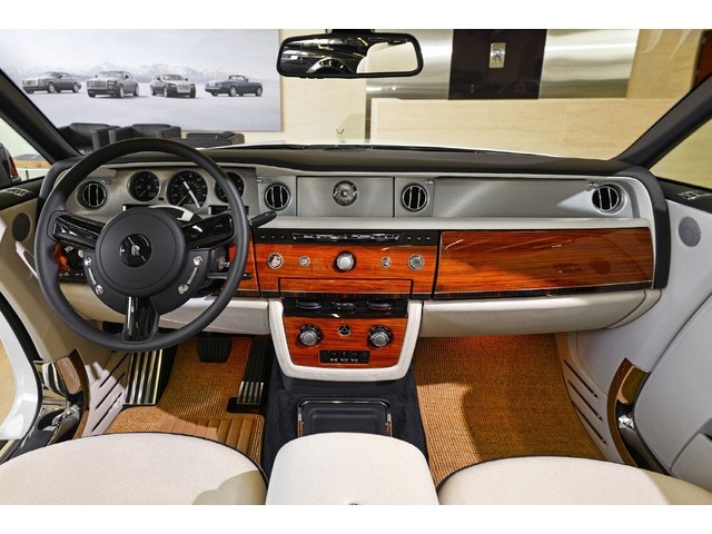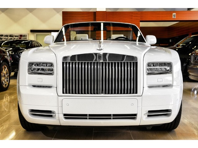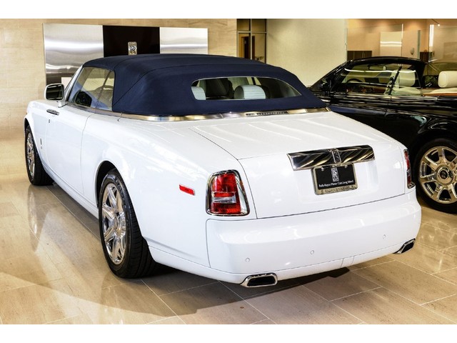 2013 Rolls-Royce Phantom Drophead Coupe (Series II) in Arctic White with Seashell hide interior, Navy Blue secondary hide and Xband Santos Palissander Veneer. Additional features include Coloured Grille Surround, Seat Piping in Navy Blue, Teak Decking, RR monogram to all headrests in Contrast, Visible Exhausts, Camera system, Treadplates featuring ''Phantom'', 21" Fully Polished Star Wheels. MSRP MSRP $510,345