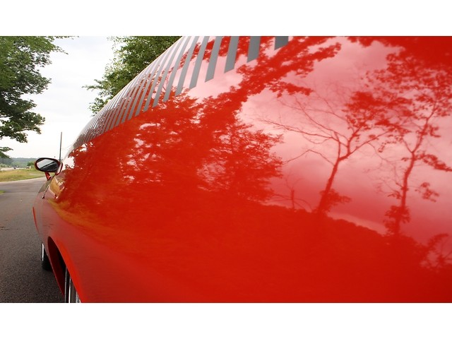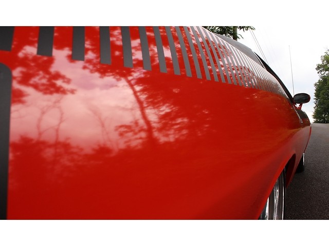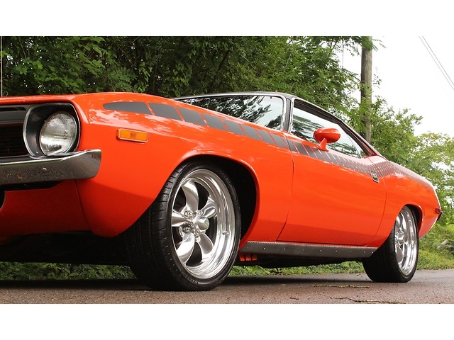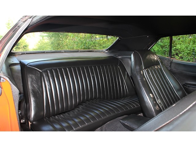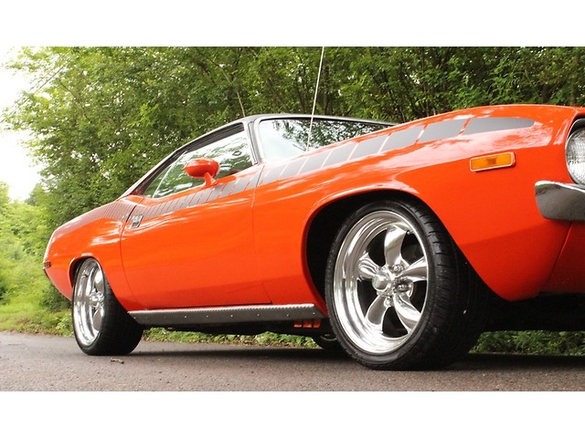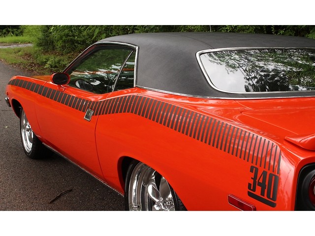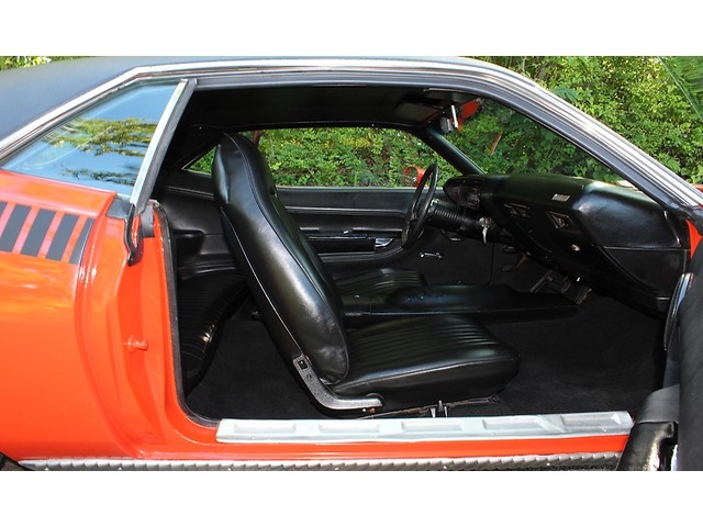 We will start off with the exterior of the Cuda. The body is solid with good straight panels with nice fit and finish. It’s covered in the Vitamin C Orange Paint that is accented by the Black Stripes and Black Vinyl top that appears to be in very good condition. This Cuda has the dual sport mirrors and the rear spoiler. The bumpers appear to be new as well as the weather stripping around the doors and trunk. The stainless looks good and may be factory. The final exterior touch is the set of 18” and 20” American Racing Wheels and Tires.