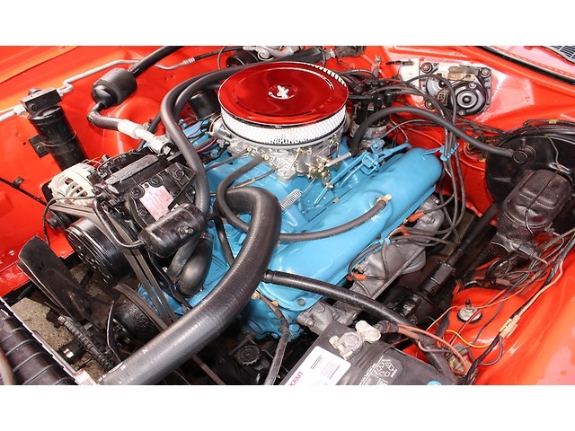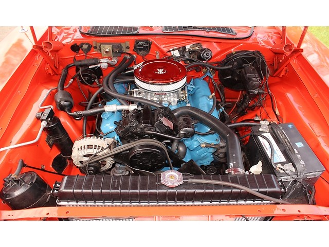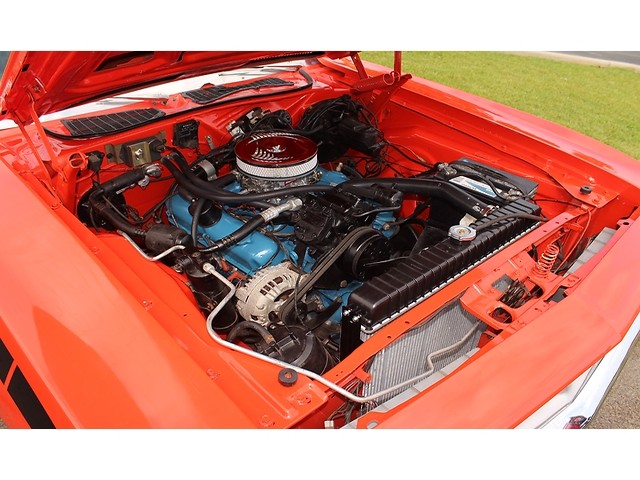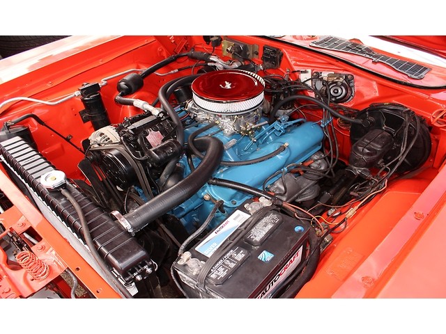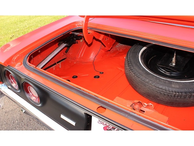 Finally, we will take a look at the driveline of the Plymouth. Under the hood it has the matching #s 318 that is mated to the 904 Trans and 8 ¾ Rear End. It has Power Steering and Power Disc Brakes. The engine is dressed with a 4 Barrel Intake, Edelbrock Carb with factory manifolds and stock valve covers. The breather has also been changed to chrome and a new radiator was installed. It’s all painted correct with the inner fenders and fire wall matching the exterior paint. The trunk of this Cuda is also correct with it being orange as well. When you look under the ’73 it has dual exhaust with stock style mufflers and the tips ran through the rear valance. The floors look good with only a rear pan on the righ side being replaced. All the frame rails look good.