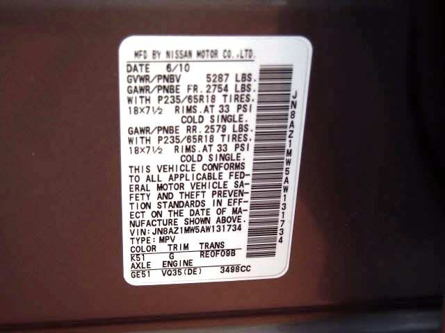 • VIN: JN8AZ1MW5AW131734