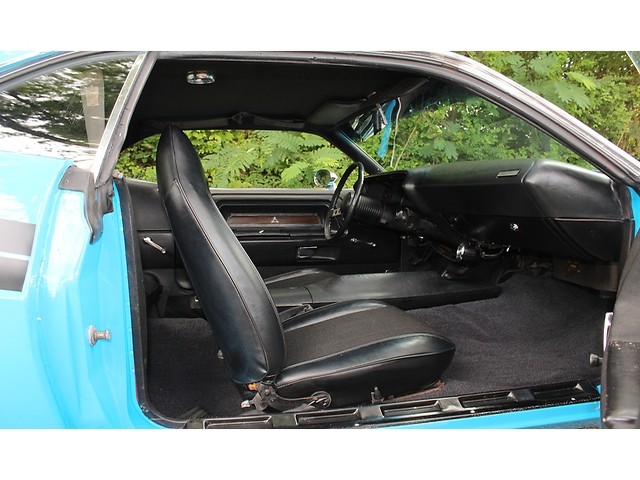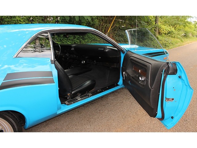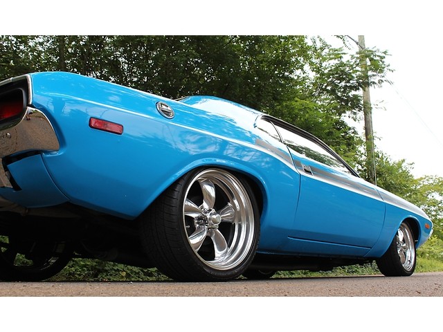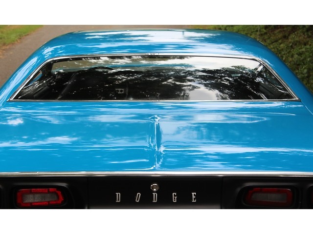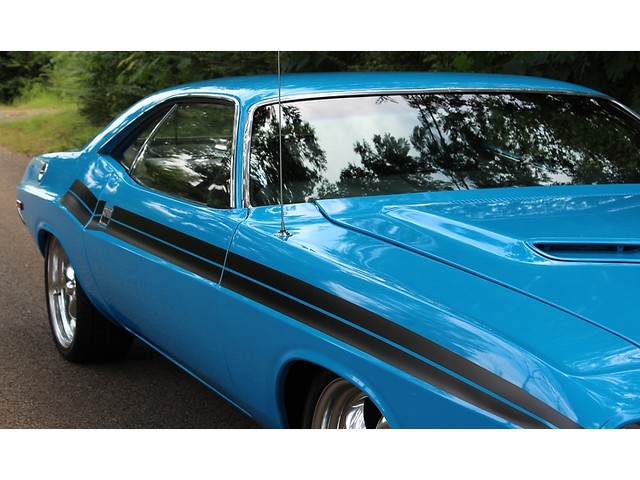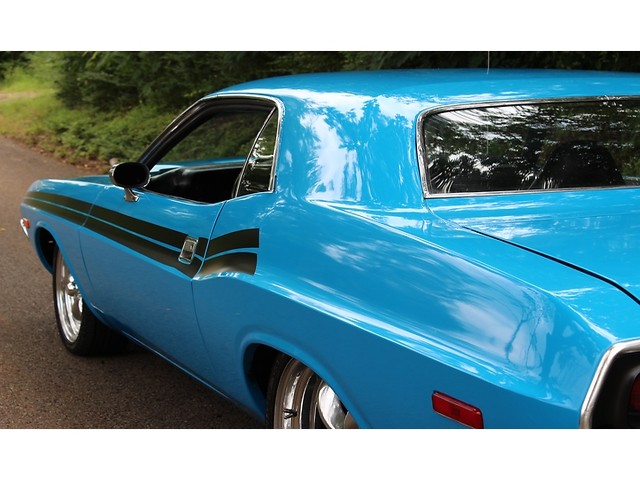 We will start off with the exterior of the Challenger. This is a very straight car with great lines and the fit and finish of the panels is very good. The body is covered in B5 Bright Blue that is accented by the Black RT Stripes. The paint looks good with a deep rich shine. It appears to have had new bumpers installed. The stainless looks factory and is in good shape. As for the weather stripping it appears to have been replaced when the car was painted. The final exterior touch is the set of new 18” and 20” American Racing Wheels and Tires.
