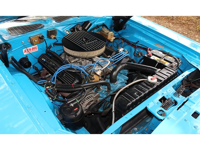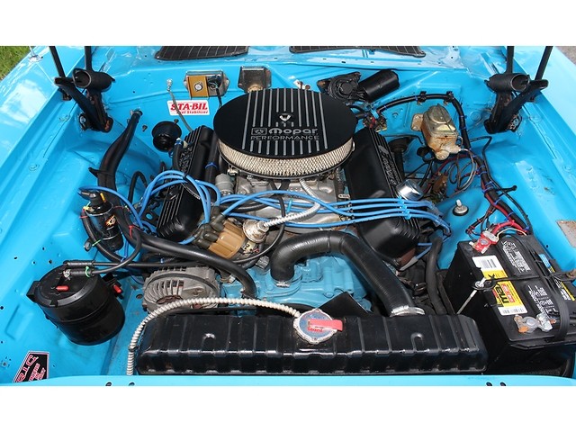 Finally, we will take a look at the drive line of the Dodge. Under the hood the engine bay is painted as it should be to match the exterior. The engine is a ’74 model 400 Big Block that is mated to a 727 Auto Trans and a 8 ¾” rear end. It is dressed with Mopar Performance Valve Covers and Breather. The exhaust was updated with headers and flows. This is a factory Power Steering manual disc brake car. The floors on this Mopar are good and appear to have no visible damage. The front and rear frame rails look very solid.