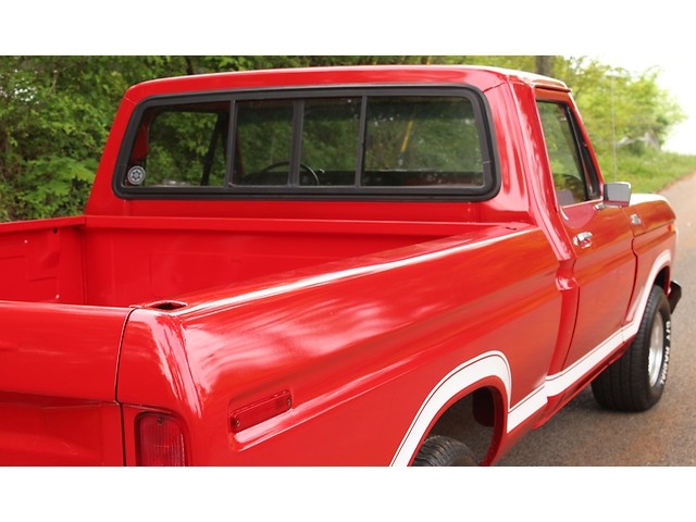 We will start off with the exterior of the Pickup. The body appears rock solid with a great fit of the panels and the bed lining up good with the cab. It’s covered in the Rally Red paint that is accented by the White Body stripes. All of the glass looks very good with the door glasses working as they should. It appears to have a new seal around the windshield and back glass. The bumpers are chrome with the rear being a step bumper. As for the grill it is nice with no signs of damage. The final touch is the set of 15x8 American Racing Wheels and white Letter Tires.