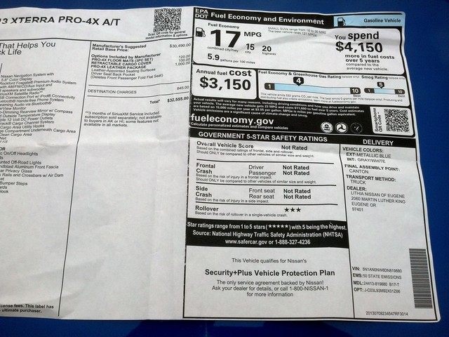 Featured here on Ebay is our 2013 Nissan X-Terra Pro X4 4x4 Sport Utility. Virtually like new throughout! Only 319 adult driven miles. Stunning Metallic Blue paint with the optional Charcoal Gray leather interior. Fully loaded with options including: Rockford Fosgate Premium audio system with Sirus XM and Bluetooth, Navigation, rear-view monitor. Awesome to drive with 261hp and 5 speed Automatic transmission. The Pro 4X models have many upgrades over the standard models including high performance Bilstein shocks, hill decent control, hill start assist, 16-inch machined alloy off-road wheels and rugged trail tires.