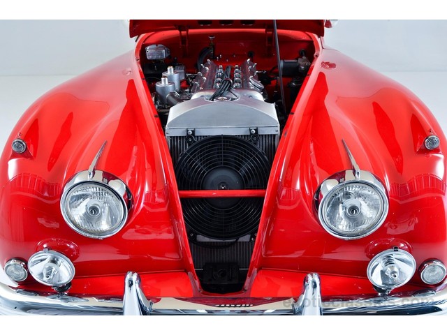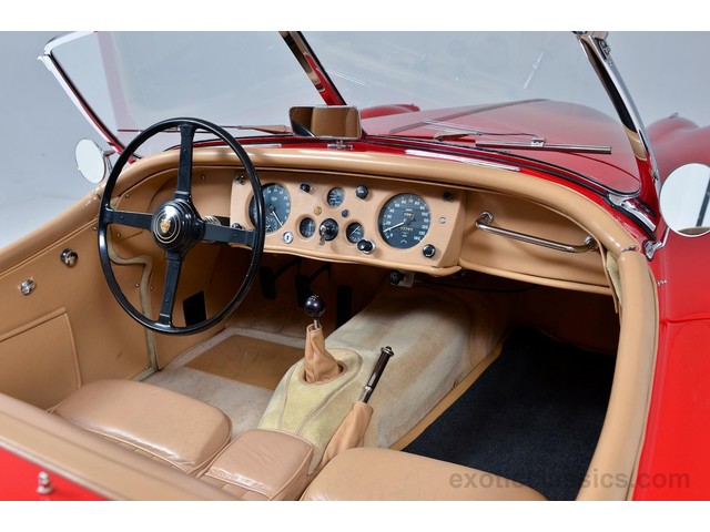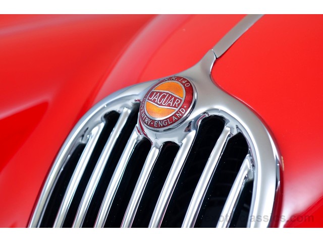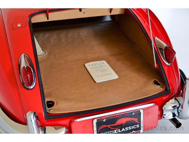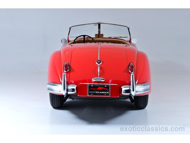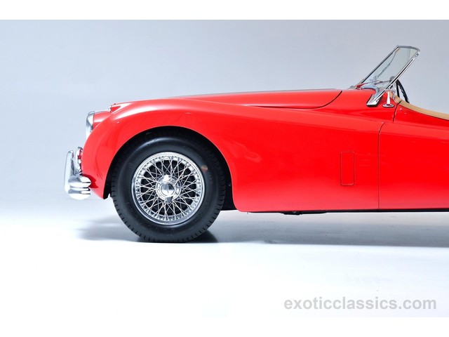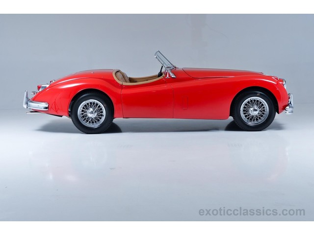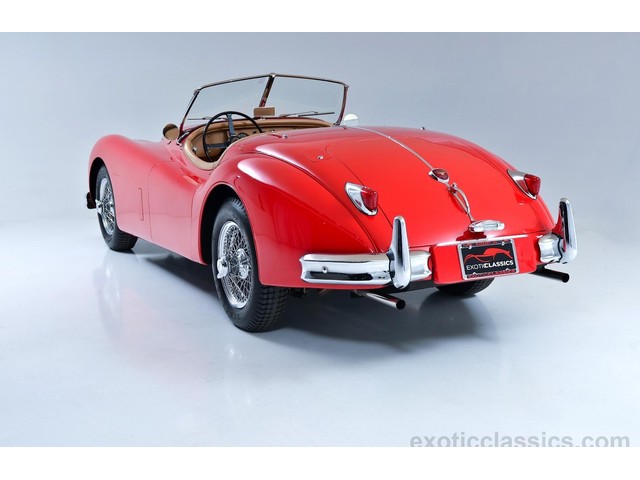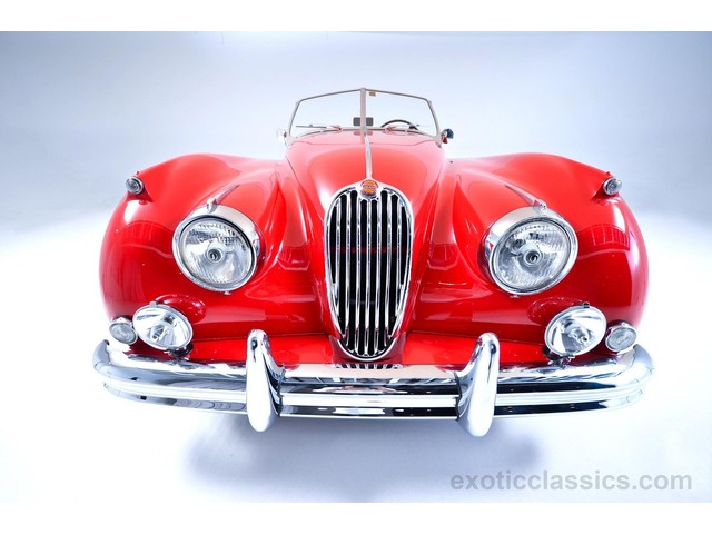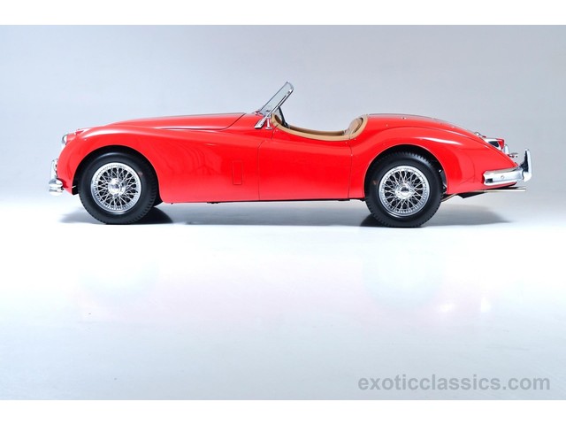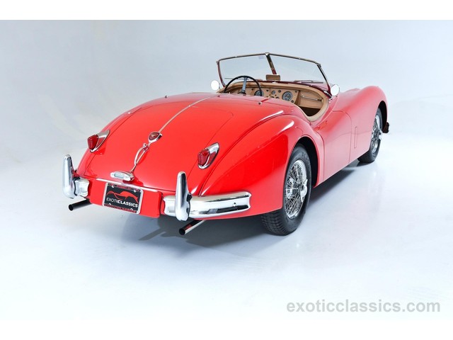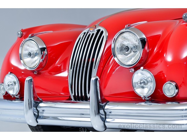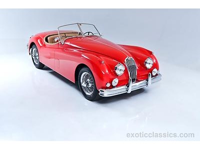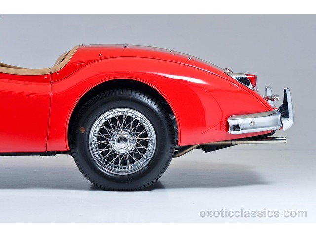 1954 JAGUAR XK140M ROADSTERExotic Classics is proud to present this classic 1954 Jaguar XK140M Roadster. This car is featured in Red with Tan leather. This sporty Roadster includes a new top and side curtains and rides on chrome wire wheels and new tires in the correct 16” size. The car was been completely restored with a mechanical rebuild in 2011. Mechanical upgrades were made for reliable high speed touring. Foremost among them is a 5-speed manual transmission for relaxed cruising with a new clutch and pressure plate. Additional measures include elastomeric suspension bushings, stainless steel exhaust, aluminum fuel tank and radiator, and electric cooling fan. The electrical system was upgraded with an alternator high-voltage solid state ignition, and a heavy duty starter. The car also is equipped with the Special Equipment package consisting of fog lamps and dual exhaust pipes. These improvements ensure that the Roadster’s performance and reliability will match its stunning appearance. This XK140 is eligible for the most prestigious tours, shows and rallies and includes a Jaguar Daimler Heritage Trust Certificate of Authenticity.