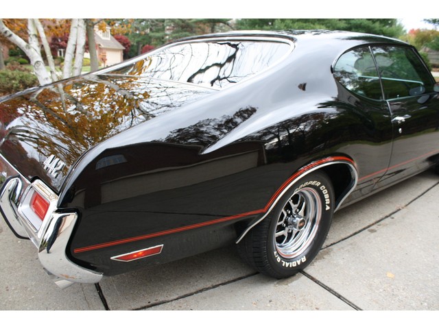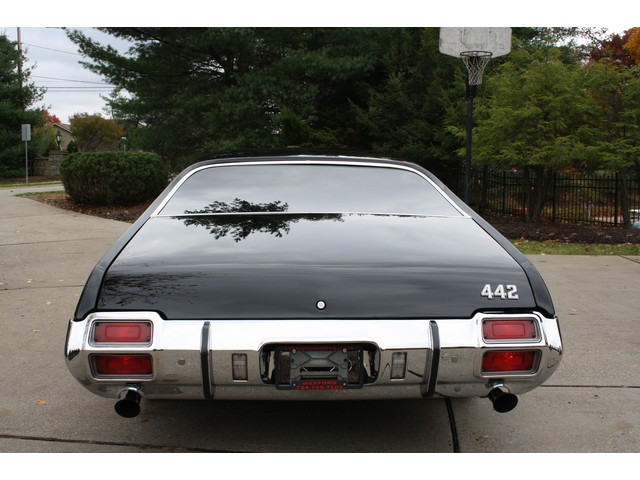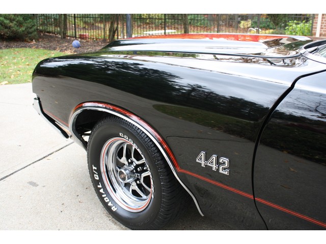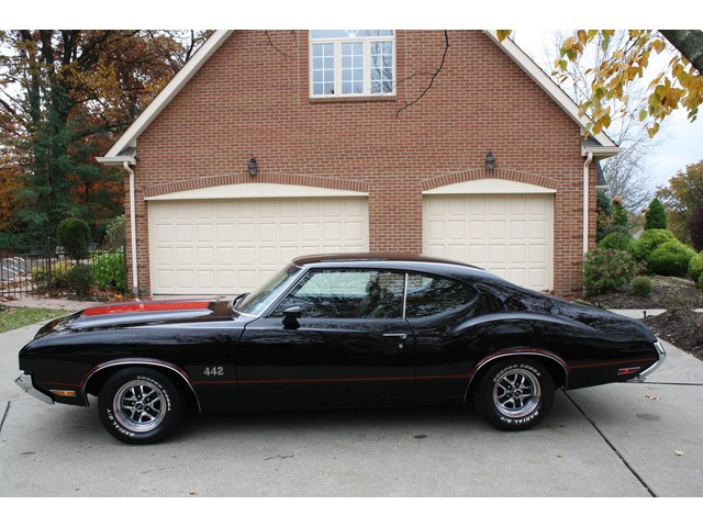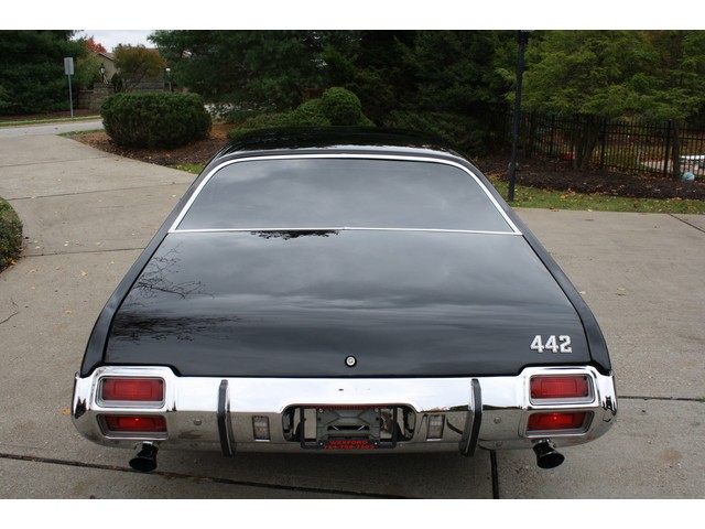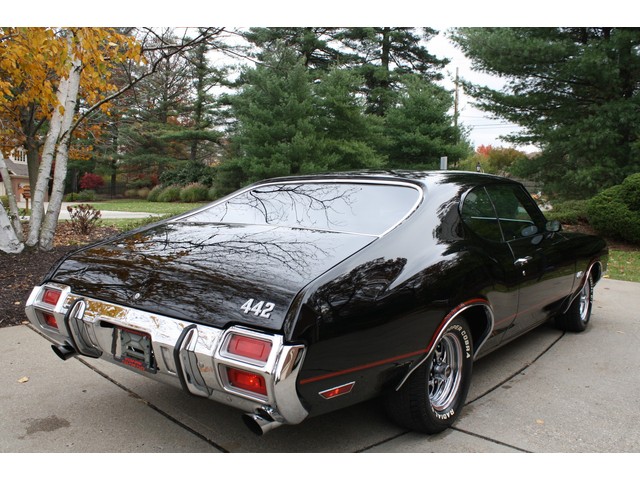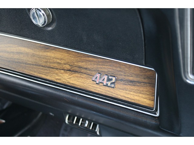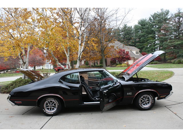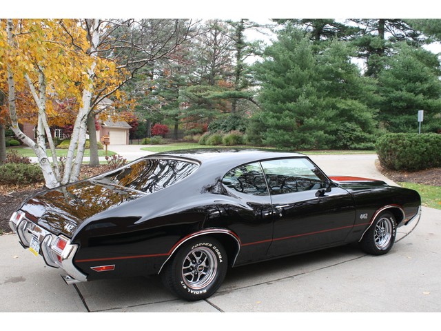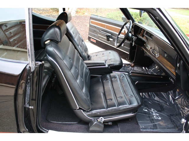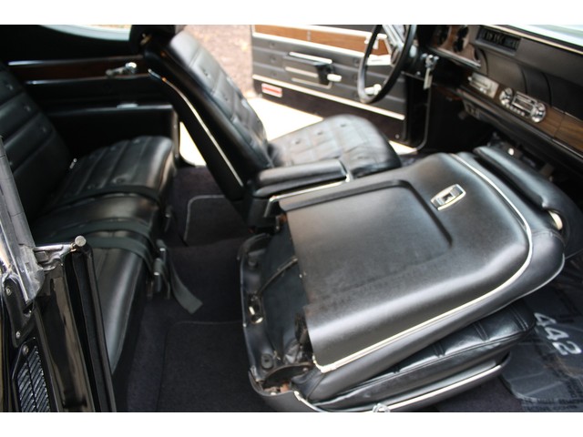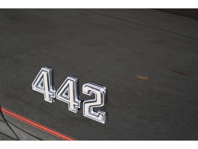 The wheels are 14 inch Oldsmobile wheels and they are in excellent condition. The front tires are new and the rear tires have about 75-85% (Tire size: FRONT P235/60R14 REAR 245/60R14). The interior of the Oldsmobile is clean. The seats are in great shape. Headliner is in great shape, carpet is clean and dash board is in good shape. The interior on the 442 is a 9 out 10. The black paint on the 442 looks great! The exterior on the 442 is clean. The paint shines nicely and is glossy. There is a few light scratches on the car here and there. Below the drivers door handle there is two 3-4 inch light scratches in the paint, the hood has a few small defects; few scratches around the two chrome hood hold downs, other then that there may be a few scratches here and there. I would rate the exterior an 8.5 out of 10. This car is truly one of a kind!
