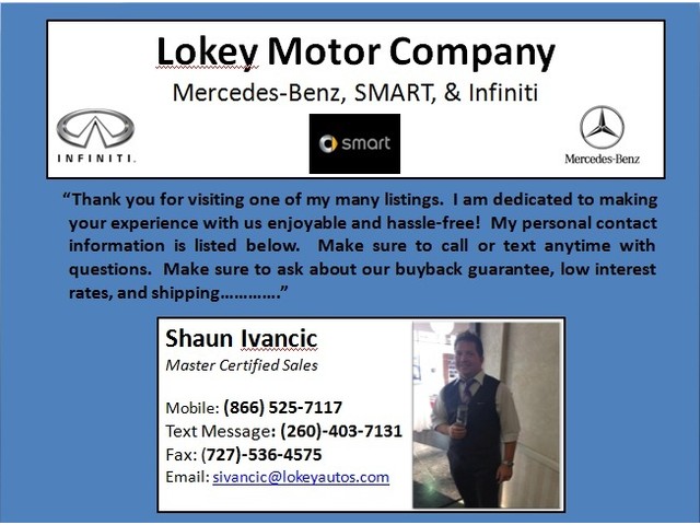 Lokey is a very well known and respected name in the Tampa Bay, FL. area. The Lokey Motor Company is one of the Largest Family Owned Mercedes Benz, Infiniti, and Smart dealerships in Florida. Lokey has Always ranked at the top, with one of the best customer satisfaction ratings in the Automotive Industry. Lokey Motor Company has Sold and Serviced well over 1,000,000 Vehicles. Bid with Confidence!