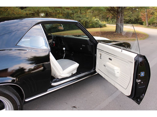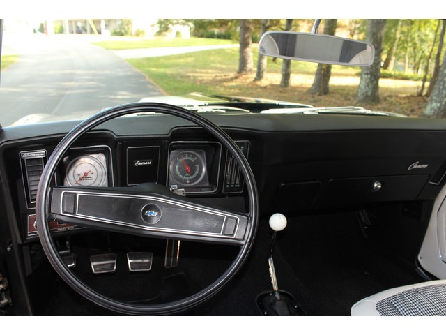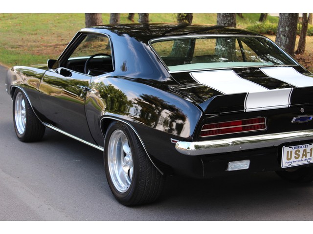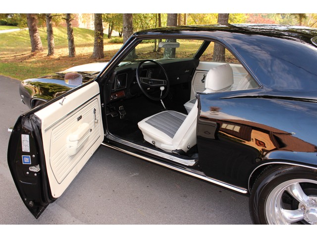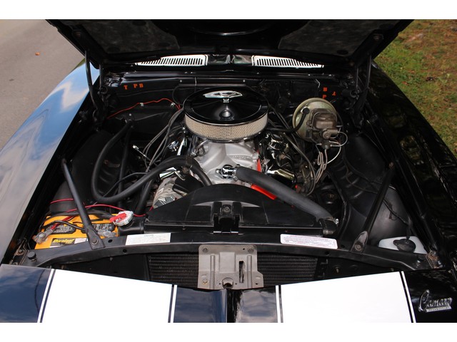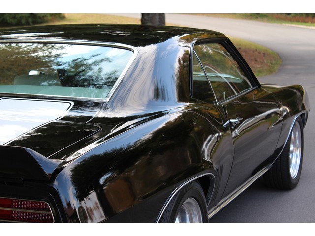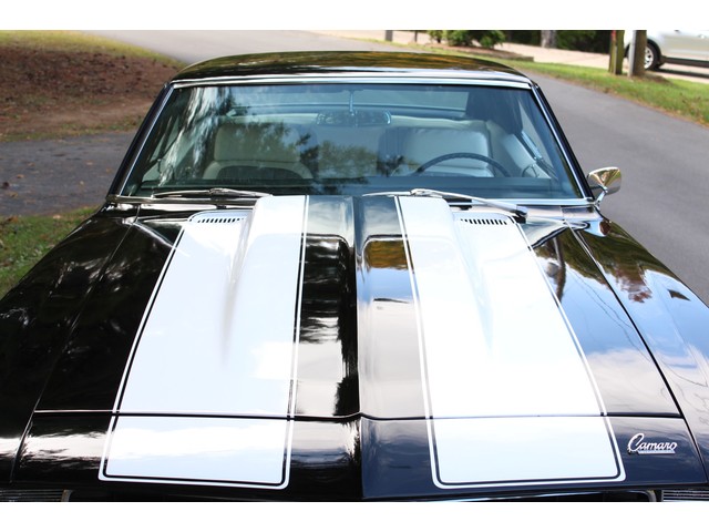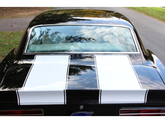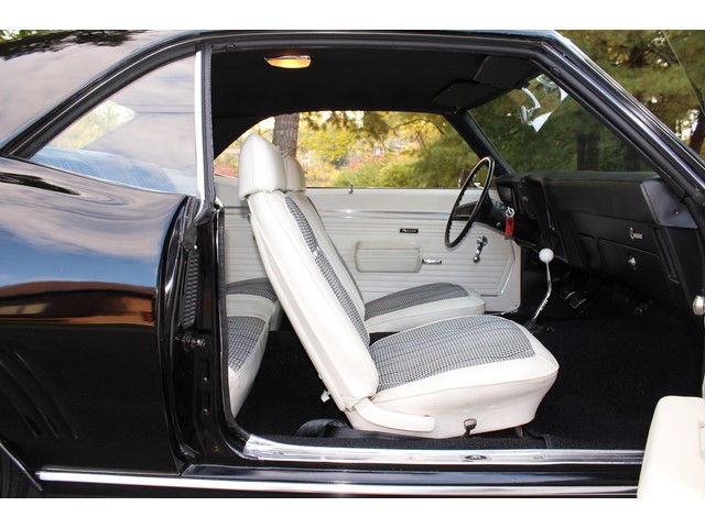 We will start off with the exterior of the Camaro. The body is laser straight with great lines. This car was taken to the metal before being covered in the Tuxedo Black that is accented by the white Z stripes that has all been buffed and polished to a deep rich shine. As with any good resto they added new bumpers and other chrome. Also it has new weather stripping to ensure a good fit of the doors and trunk. The final exterior touch is the set of 17” American Wheels.