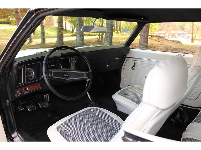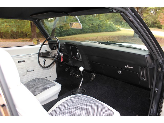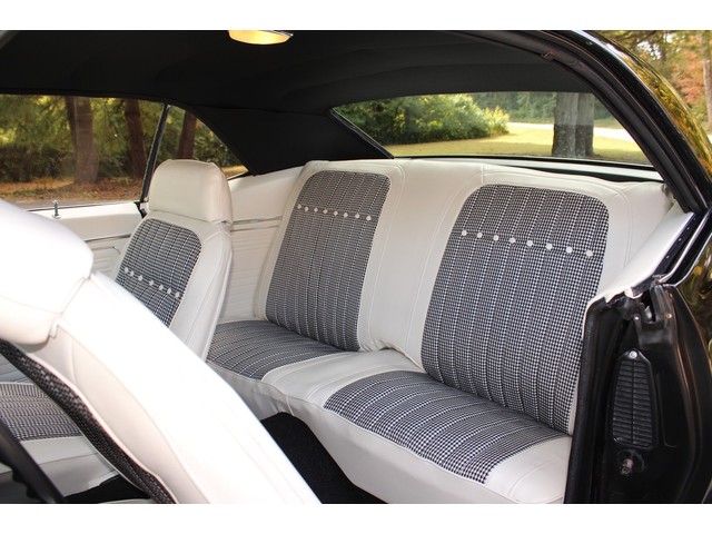 Next, we will take a look at the interior of the ’69. It’s all done in white and provides the perfect complement to the exterior scheme. It comes with bucket seats that are covered in the White Houndstooth along with the rear seat. The door panels are white with the headliner, carpet, and dash being done in black. This is a radio delete car and a non-console car.