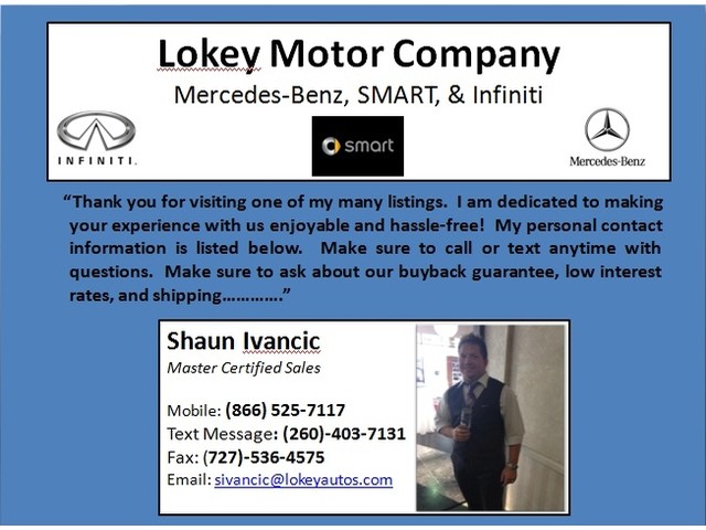 Lokey is a very well known and respected name in the Tampa Bay, FL. area. The Lokey Motor Company is one of the Largest Family Owned Mercedes Benz, Infiniti, and Smart dealerships in Florida. Lokey has Always ranked at the top, with one of the best customer satisfaction ratings in the Automotive Industry. Lokey Motor Company has Sold and Serviced well over 1,000,000 Vehicles. Bid with Confidence!