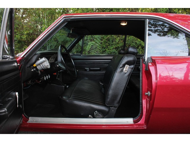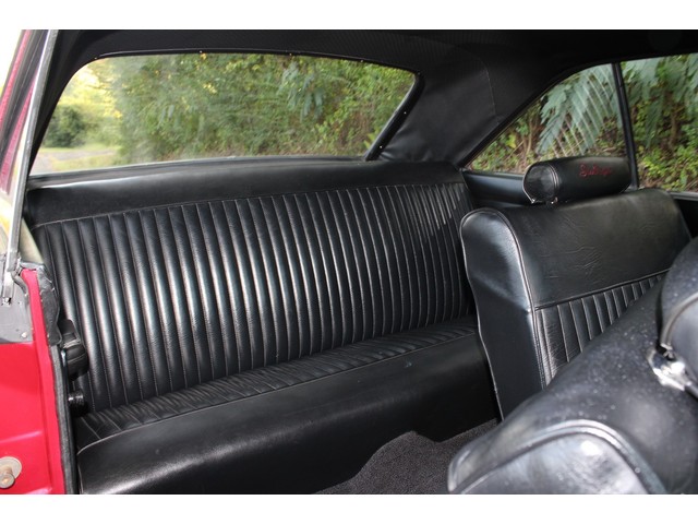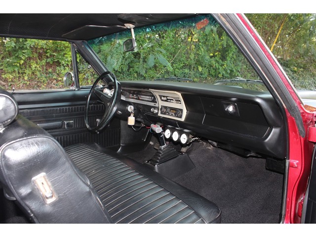 Next, we will take a look at the interior of the 70. It’s all done in classic black with the correct bench seats. Both of the seats, carpet, and headliner look like new as well as the dash pad. The door panels look good. The shifter has been changed to a floor mount B&M Ratchet Shifter. They added a set of autometer gauges under the dash and a tach with shift light. This dart retains the factory style seats belts.