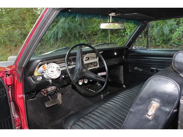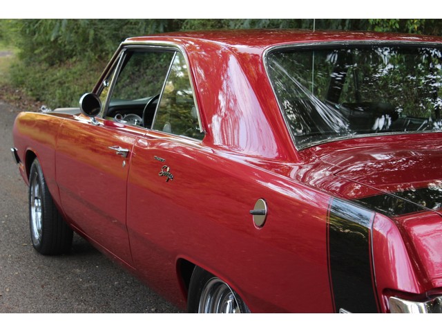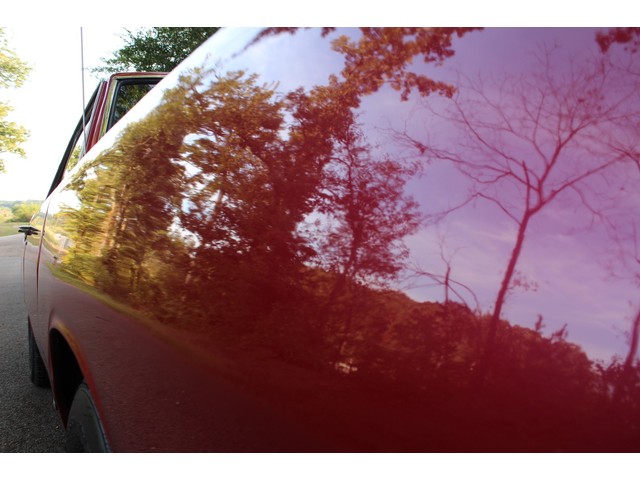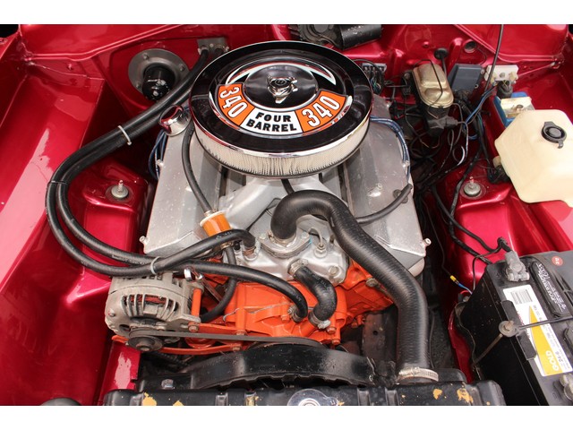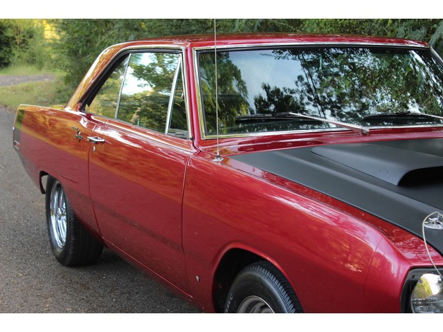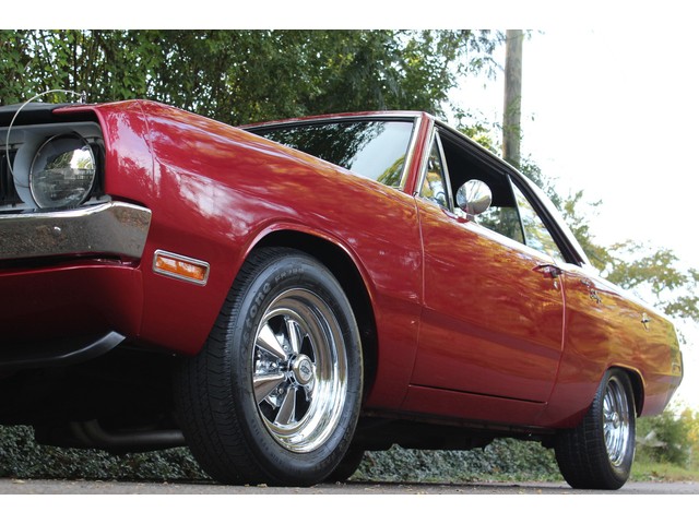 We will start off with the exterior of the Dart. The body looks solid with good lines. All the gaps and panels alignments are very good. It’s covered in the Raspberry Metallic paint that is accented by the tail stripe and blacked out hood with the dual scoops and factory style hood pins. The stainless and trim all looks good. All the weather stripping and widnow felt is in good shape. As for the glass it’s good and the side windows working as they should. The bumpers look good, but we are not sure if they’re new. The final exterior touch is the Cragar SS Mags with good tires.