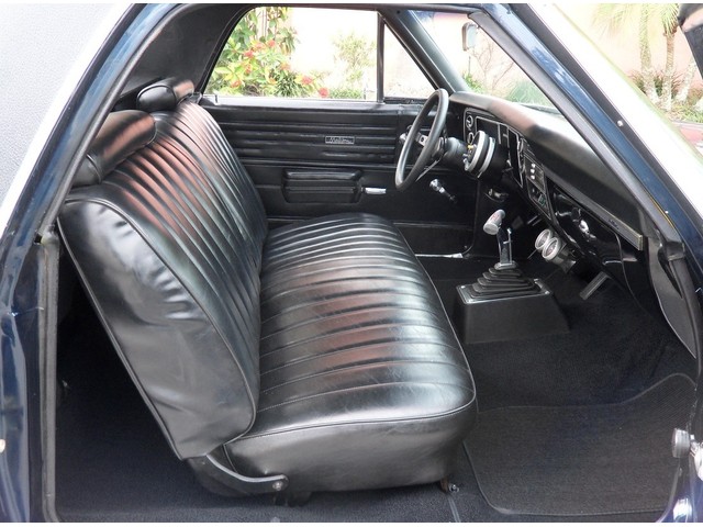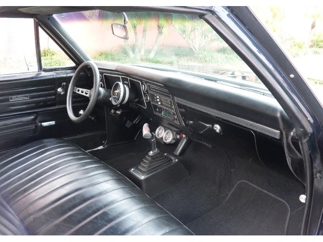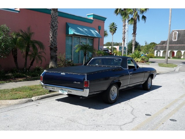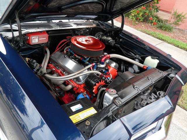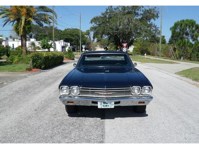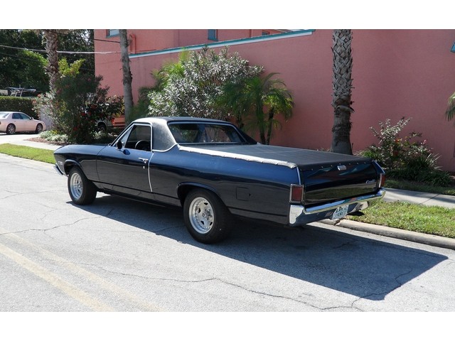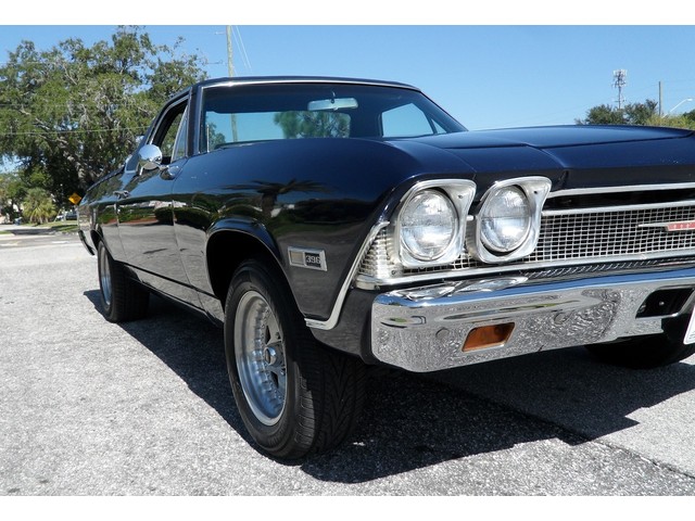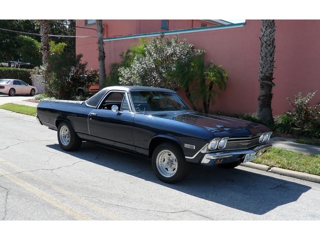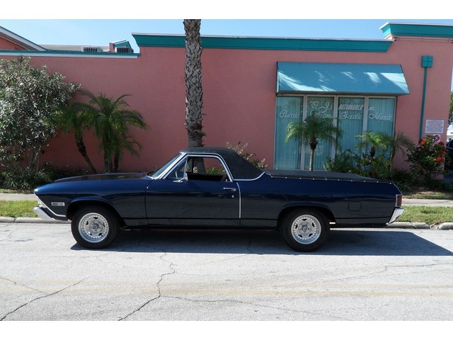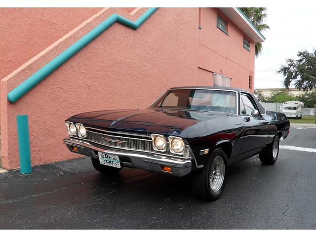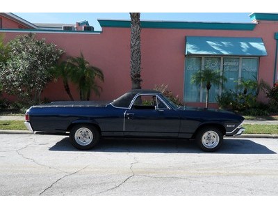 1968 Chevrolet El Camino For Sale. 396 cubic inch V8 engine, Holley 4 barrel carburetor, MSD electronic ignition, dual exhaust, TH 400 automatic transmission, 12 bolt rear end, power steering, Areospace components 4 wheel power disc brakes, 15" Center Line alloy wheels with radial tires, dark blue metallic exterior, black vinyl top, tonneau cover, chrome sport mirrors, black standard vinyl interior, auxiliary Auto Meter gauges, AM/FM/Cassette radio with power antenna. Great running engine, very clean underside. If your looking for a deal this big block El Camino is it!!!