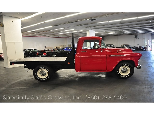 This 1955 Chevrolet 3200 Flatbed Dump Truck has been with the current owner since 1983.  It was purchased new by a local tree service right here in Palo Alto, CA as well so we believe that this is a lifetime classic.  The current owner had the body and the interior restored about 20 years ago but since it has been indoors ever since, it’s a beautiful truck that shows very little wear.  It was recently tuned up as well so it runs great (new master cylinder, wiring harness, rebuilt carb, tires, brakes, etc.).  Also, the engine is 13 years old but it has a mere 200 miles on it.