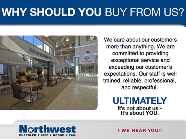 I invite you to read the biographies of our sales associates employed here. I strive to ensure that Northwest Chrysler Jeep Dodge Ram hires only those who are of extremely high integrity, morals, ethics and character. I welcome you to our dealership, where I believe you will witness an entirely different and most enjoyable car buying and service experience. One like you have never had before.