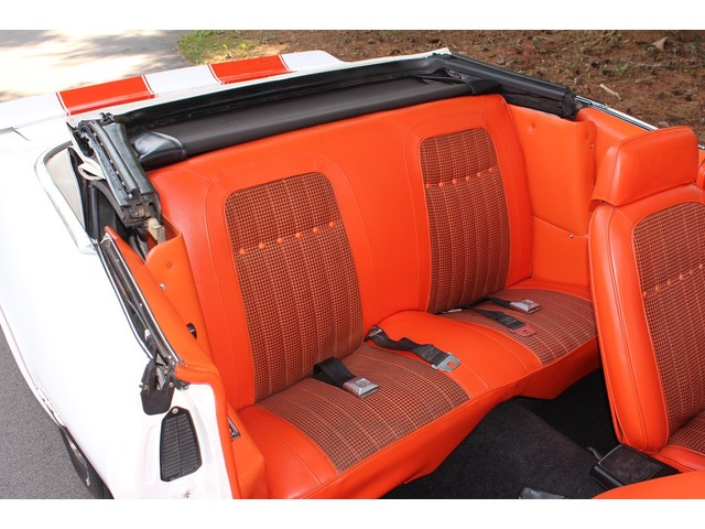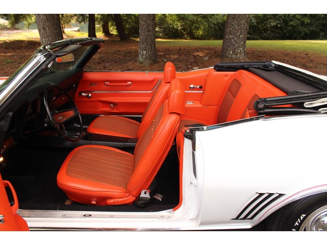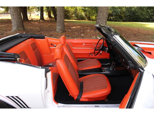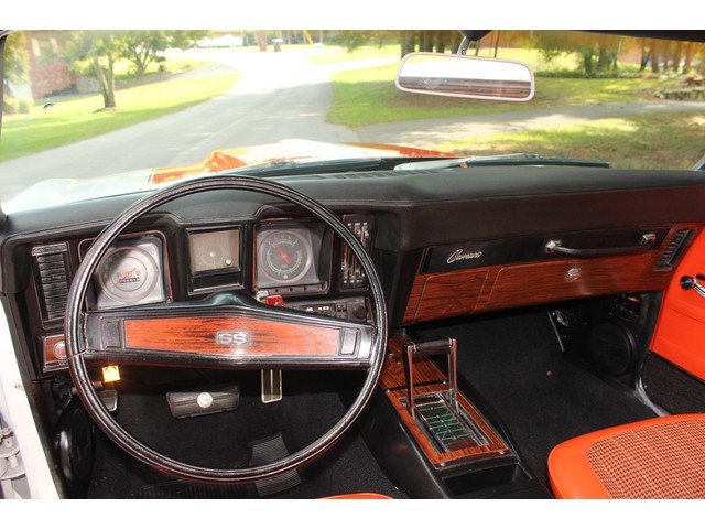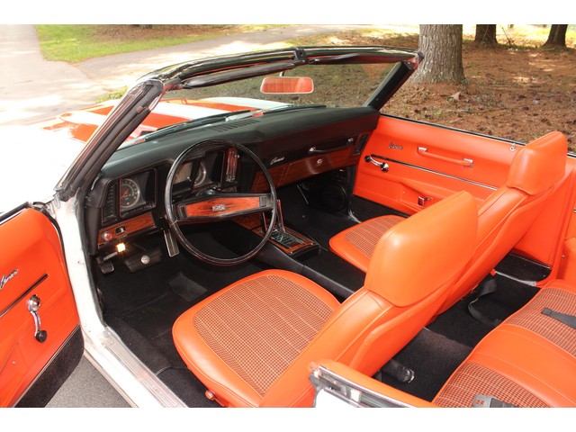 Next, we will take a look at the interior of the Camaro. It has the correct buckets, console, and horseshoe shifter. The seats are done in the Orange hounds tooth with the Deluxe Orange Door Panels. The carpet and dash is black with both being nice. This Camaro has the wood grain dash trim. The dash is all correct with the exception of the upgraded radio. As with a lot of Camaro it has a Manual Top that works very well.