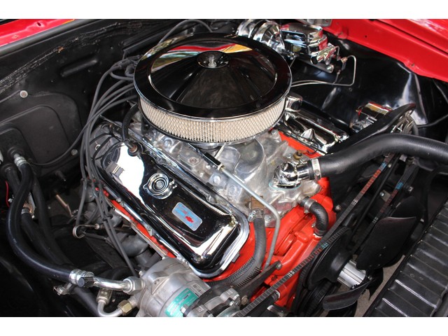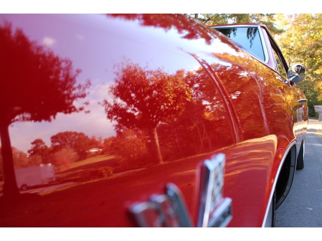 We will start off with the exterior of the Chevelle. When you look down the sides it’s as straight as an arrow and solid as rock. We were told this Chevelle has only 1 repaint since it was bought new. Original a butternut yellow car it is now covered in bolero Red that is accented by the new bumpers and other chrome. All the stainless looks very good as well as all the glass. The weather stripping along with the body gaskets were replaced at the time of the resto. By looking at the paint we believe this car was taken apart to be painted and it has been buffed and polished to a deep rich shine. The final exterior touch is the set of 18” and 20” American Racing wheels and tires.