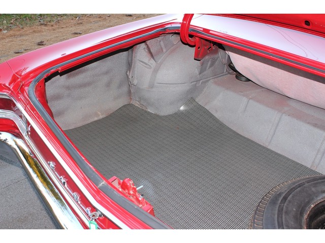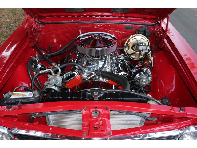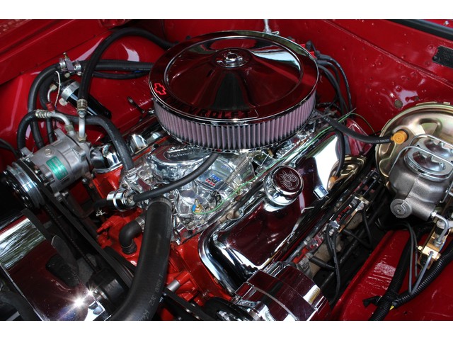 Finally we will take a look at the heartbeat of the Chevy. Under the hood it all done in red from the fire wall to the inner fenders. It’s powered by the 454 V8 that is mated to a 700R Overdrive Trans and 12 Bolt Rear End. The engine is dressed with a polished aluminum intake, Holley Carb, Chrome valve covers, chrome breather, and chrome alternator. It retains the factory style manifolds and a set of Flow Master Mufflers. The Master Cylinder and booster were also replaced and it has Front Disc Brakes. As for the steering it’s power as well and the vintage ac and heat is fitted nicely. When you look at the bottom of this SS it’s rock solid with no visible signs of rust or rot.