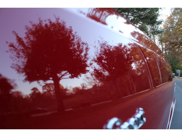 We will start off with the exterior of the Chevelle. When you look down the side of this Chevelle It’s laser straight with good fit of all the panels. Everything is covered in the Regal Red Base Coat Clear that has been buffed and polished to a deep rich shine. It’s accented by the new Dark Red canvas style top and glass with the new boot that matches the interior. Also it’s got new bumpers as well as other new chrome that was installed at the time of the resto. As for the stainless it looks like new or in like new condition, and the same goes for the weather stripping. The final exterior touch is the set of 18” and 20” American Racing Wheels and Tires on the Corners.