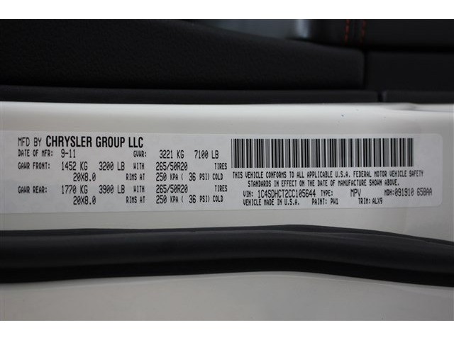 Tired of the same tedious drive? Well change up things with this wonderful-looking 2012 Dodge Durango. It is nicely equipped with features such as Leather Interior Group (Auto-Dimming Exterior Driver Mirror, Exterior Mirrors w/Memory, Exterior Mirrors w/Supplemental Signals, Heated Front Seats, Heated Second Row Seats, Power 6x9 Multi-Function Foldaway Mirrors, Power 8-Way Driver Memory 6-Way Passenger Seats, Power Tilt/Telescopic Steering Column, and Radio/Driver Seat/Mirrors Memory), Durango R/T, Stone White Clearcoat, Black w/Luxury Leather Trimmed Bucket Seats, 3rd row seats: split-bench, 6.5 Touch Screen Display, 9 Speakers, ABS brakes, Air Conditioning, Alloy wheels, Automatic temperature control, CD player, Dual front impact airbags, Dual front side impact airbags, Electronic Stability Control, Front dual zone A/C, Garage door transmitter, Garmin Navigation System, Leather Shift Knob, Leather Trimmed Bucket Seats, MP3 decoder, Occupant sensing airbag, Overhead airbag, ParkView Rear Back-Up Camera, Power driver seat, Power Sunroof, Power windows, Rear air conditioning, Rear DVD Entertainment Center, Rear Overhead Console, Rear seat center armrest, Rear-Seat Video System, Remote keyless entry, Speed control, Steering wheel mounted audio controls, Telescoping steering wheel, and Traction control. Lots of get-up-and-go for a superb price in this so-much-fun to drive Durango.
