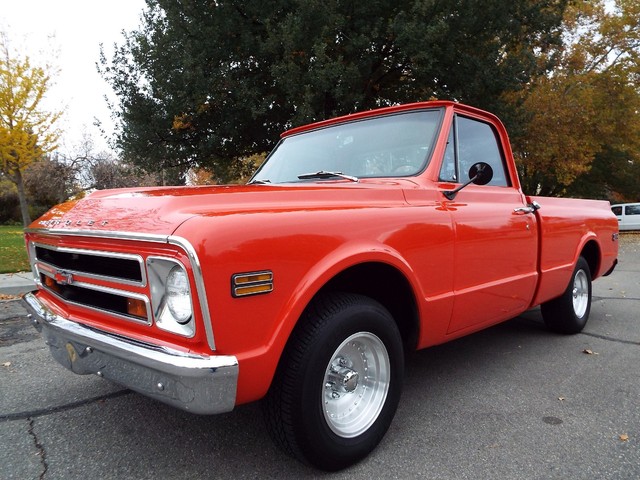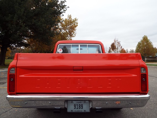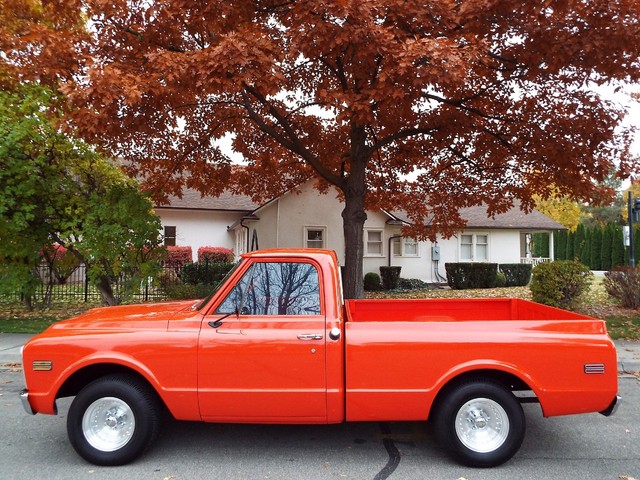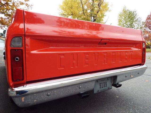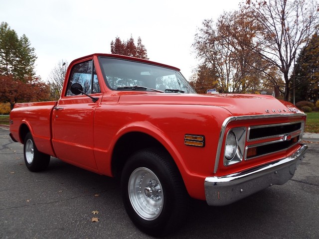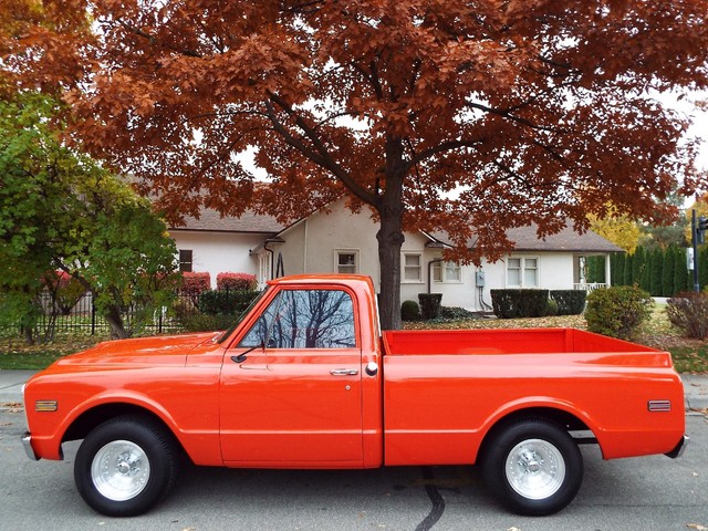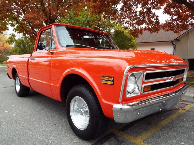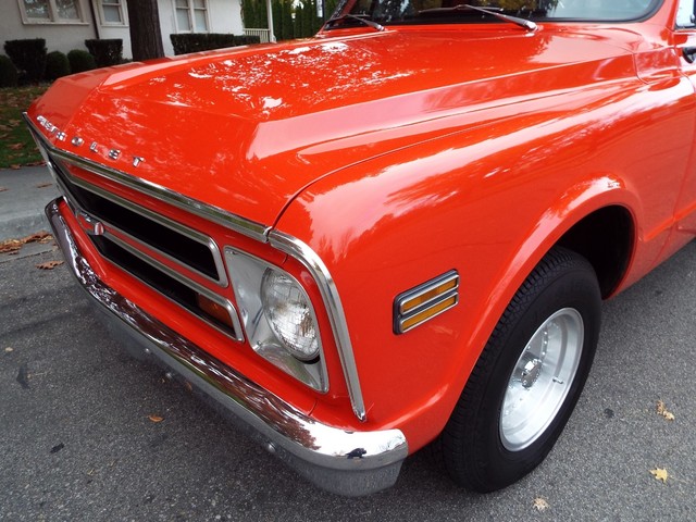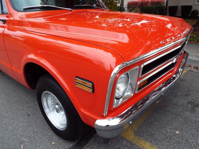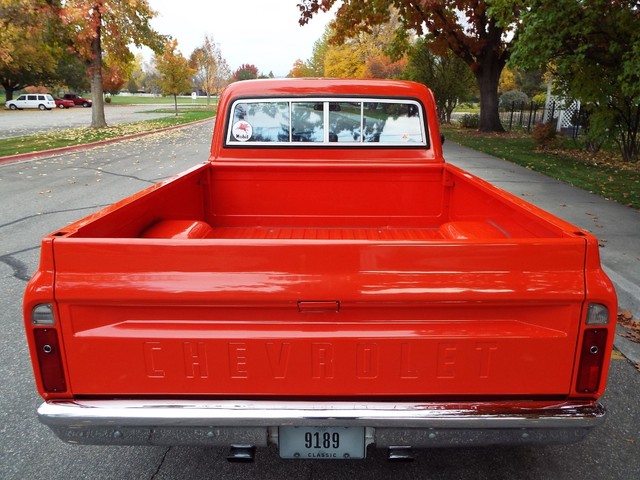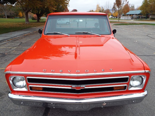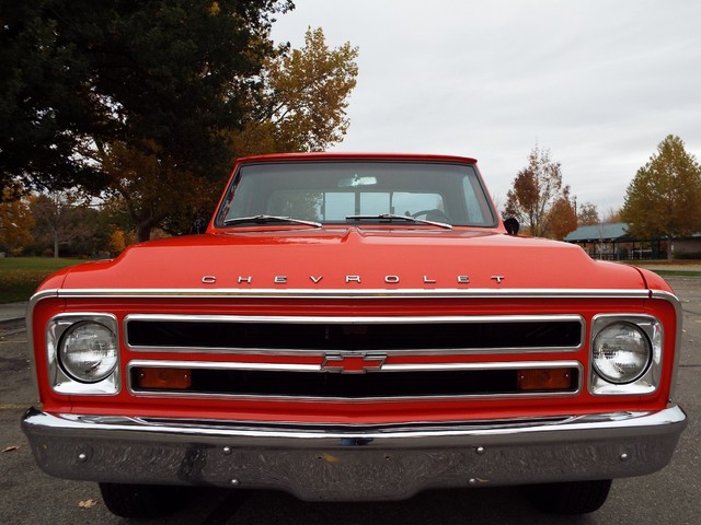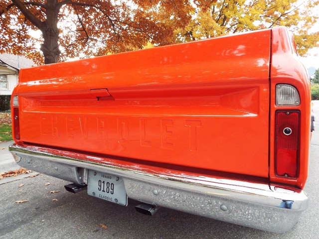 This is a NICE - DRY - SOLID - Idaho High Mountain Desert - western  truck and it shows !! In my opinion your not going to find much nicer ORIGINAL FLOORS than the ones that are on this BEAUTY, UNBELEIVABLE !! The EYE POPPING BEAUTIFUL Hugger Orange  exterior paint is in VERY NICE shape with really little to no wear showing other than a few small chips and is still bright and shiny and looks STUNNING as you can clearly see in the video above and the 100 pictures below. This Chevy C10 Short Wide Box Hotrod Pickup is nicely equipped including factory power steering, factory power brakes, dual exterior side view mirrors, good tinted glass, custom frenched in power antenna, factory gauge package with a rare factory tachometer, factory power wipers, original factory day / night rear view mirror, good heater and defroster, awesome Realistic AM /  FM / cassette player stereo radio, factory seat belts, factory back up lights, "blue dot" taillights, factory wing windows, sliding rear window and a frenched in power antenna. All of the rubber weatherstripping is soft and supple and is in good condition !! The electrical system is also all  in good working condition. This C10 is in good condition from top to bottom and from front to back. It will not disappoint someone looking for a clean example of a sought after and hard to find classic "Muscle  Truck" which is not seen at every stop light for sure. If you have been looking but cannot find a sharp '68 C10 Short Wide Box worthy of your hard earned money look NO further because this is the one! The Clean - Solid - Straight bed is also in NICE condition, you would be hard pressed to find a nicer one !! The ORIGINAL chrome and stainless steel body trim is in VERY NICE condition including VERY NICE Chrome front and rear bumpers, NICE ORIGINAL stainless steel grill, NICE ORIGINAL stainless steel front trim and headlight surrounds. Check out the custom frenched in power antenna, TOO COOL !! All of the ORIGINAL light lenses and reflectors are clear, bright, UNCRACKED and look BEAUTIFUL !! Check out the AWESOME  "Ultra" billet centerline  wheels wrapped in nearly new Kelly steel belted radial tires !! Boy does this combination look OUTSTANDING on this truck and give it that mean "Muscle Truck" look !! This vehicle is in GREAT mechanical condition and it runs and drives very well. It is solid with respect to the overall mechanical condition as well as the overall cosmetic  impression. I looked underneath and included 100 photos below some of which show the undercarriage. Again this is a NICE - SOLID - DRY - Idaho High Mountain Desert - Western truck!