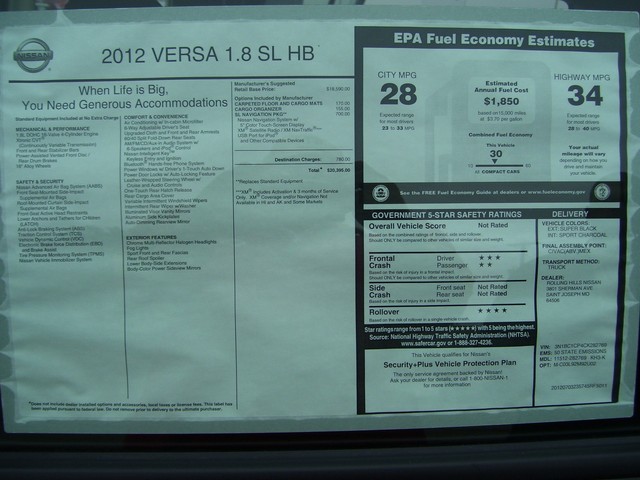 The Nissan Versa hatchback is powered by a 1.8-liter  four-cylinder that produces 122 hp and 127 lb-ft of torque. The Versa hatchback SL comes standard with a CVT, which brings fuel economy up to 28/34/30.